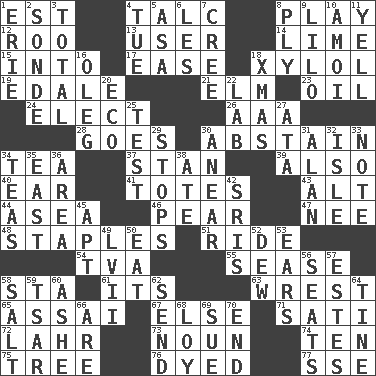 ACROSS 1. Eastern Standard Time (abbr.) 4. Baby powder 8. Romp 12. Friend of Pooh 13. One who makes use of a thing 14. Citrus frut 15. To the inside or interior of 17. Relaxation 18. Xylene (variant) 19. Peak District village in England 21. Shade tree 23. Lubricate 24. Voters do this 26. Auto club (abbr.) 28. Moves 30. Choose not to consume 34. Afternoon social gathering 37. Comedian Laurel of Laurel & Hardy 39. In addition 40. Hearing organ 41. Hauls 43. The first octave above the treble staff 44. At sea 46. Lightbulb-shaped fruit 47. Born 48. Paper fasteners 51. Travel on or in a vehicle 54. Federal power corp. 55. Gospel singer Marvin 58. R.R. building 61. ___ a Wonderful Life 63. Obtain by seizing forcibly or violently 65. Slender Brazilian palm 67. Otherwise 71. Suttee (variant) 72. Cowardly lion portrayer 73. Part of speech 74. Nine, plus one 75. Woody plant 76. Colored 77. Compass dir. DOWN 1. One of the Great Lakes 2. Message 3. "_____ Recall" 4. Third day of the wk. 5. White ___ sheet 6. French article 7. Algonquian 8. Apply oneself diligently 9. _ and Stitch 10. Mine, in Marseilles 11. Shout 16. Cassini of fashion 18. Dec. holiday 20. Environmental prefix 22. Experiment locale 25. Trial 27. _ moment's notice (2 wds.) 29. Constricts 30. Approach 31. ____ Jay Lerner 32. Small island 33. Musical sound 34. Afternoon social gatherings 35. Compass direction 36. Length times width 38. Had dinner 42. Indian titles of respect 45. Fitting 49. 57 in ancient Rome 50. Erode 52. Morning condensation 53. Hearing organs 56. Theater features 57. _____ Park, CO 58. Table seasoning 59. Russian ruler of old 60. American tennis player Robert 62. Post 64. Prong on a fork 66. "We ___ not amused" (Victoria) 68. Myrna of the movies 69. Take to court 70. Conclude