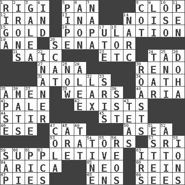 ACROSS 1. Swiss mountan, "Queen of the Mountains" 5. Baking dish 8. Hoof sound 12. SW Asia republic 13. _ tizzy (2 wds.) 14. Annoying sound 15. Gilt 16. Census information 19. One (Scot) 20. Elected representative 21. Ketch in the Levant 23. And so on (abbr.) 24. Bit 27. Grandmother 30. Former U.S. Attorney General Janet 31. Ringlike coral islands and reefs 34. Pledge 35. So be it 38. Puts on (as clothing) 40. Roberta Peters solo 41. Diluted with white 42. Is 44. Move through with a circular motion 45. Proofreading order 46. Compass dir. 47. Domesticated feline 50. Toward the sea 53. Speakers 57. Indian title of respect (Mr.) 59. Supplying deficiencies 63. "Tell ____ the Marines!" 64. N. Chile seaport 65. Modern: prefix 66. It's straight from the horse's mouth 67. Sliced desserts 68. Followers of ems 69. Perceives with the eye DOWN 1. Capital of Latvia 2. Removes the wrinkles 3. An organ shaped like a helmet 4. Indiana (abbr.) 5. Corncob 6. At once, immediately (arch.) 7. California wine valley 8. Small bed 9. Cards in a Roman deck? 10. Bear (Spanish) 11. Fenced enclosure 14. Drug cop 17. Shoshoni 18. Car dealer's back yard 20. Get outta here! 22. More empty; more void 24. Rend 25. Opposed to 26. Capital of the state of Qatar 28. Immediately 29. Toward shelter 30. Cooks with dry heat, as in an oven 32. Not strict 33. Indian titles of respect 35. Domed church section 36. Floor protectors 37. Writer Wiesel 39. Fast jet (abbr.) 43. Afternoon social gatherings 47. Root beer relative 48. "We ___ not amused" (Victoria) 49. Make lace 51. First name in cosmetics 52. Nick name for Arthur 54. Prong on a fork 55. Baking chamber 56. Vintage cars 58. Charged atoms 59. Plant excrement 60. RI univ. 61. Sliced dessert 62. Personal Computers (abbr.) 63. Big collection agency