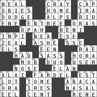 ACROSS 1. Be tempered by heat 5. Supercomputer manufacturer 9. Head covering 12. Off-Broadway awards 14. Dwelling 15. Retirement account (abbr.) 16. Evade 17. High mountains 18. To free from 19. Compass dir. 20. Main course 23. Mouths or openings 24. Brightly colored fish 25. Painter Guido (1575-1642) 27. Body of Kaffir warriors 30. Teachers' org. 32. Compass dir. 33. Ardor 34. American tennis player Robert 36. Compass dir. 38. Raised railways 39. Car or cant ending 40. Actress Charlotte 43. Possessed 46. Backtalk 48. Israeli folk dance 49. Crowd into 51. Superhero pair 52. One who uses or employs something 53. Olfactory organ 54. Enthusiasm 56. Jai ____ 58. Burden 61. Eastern Standard Time (abbr.) 64. Car dealer's back yard 65. Heavy book 66. Phillipine bananalike plant 68. Mouth or opening 69. Angers 70. Relating to the nose 71. Snakelike fish 72. Penny 73. French philosopher Descartes DOWN 1. Thickened enlargement 2. Inky black, to poets 3. Helper 4. Part of a journey 5. Burn to charcoal 6. Hero or heavy, e.g. 7. Electrical Unit 8. Consenting reply 9. High-altitude cloud 10. Roberta Peters solo 11. Writing tablets 13. Ooze 21. Nanny 22. College papers 23. Washington bills 24. Lubricate 26. Double-curved letter 27. Ending with capital 28. Cartoonist voice _ Blanc 29. Romantic infatuation 31. Toward the future 35. Followed as a consequence or result 37. Greek god of love 41. "We ___ not amused" (Victoria) 42. Ewer handle 44. Mine, in Marseilles 45. Two (Sp.) 47. Not divided or shared with others 48. Attila the _ 50. Prior to 53. Relating to or accompanying birth 55. Actor Alda or Thicke 56. _ vera 57. Old wives' tales, e.g. 59. So be it 60. Respite 61. Relaxation 62. Skim 63. Story 65. Nervous spasm 67. Tavern