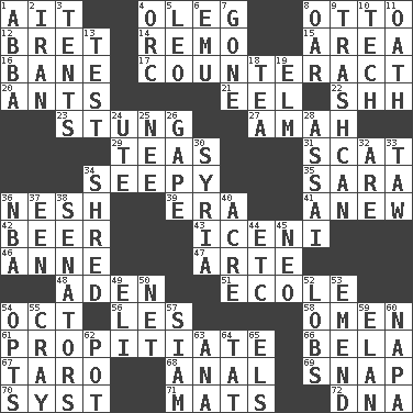 ACROSS 1. Small island 4. Cassini of fashion 8. "Beetle Bailey" pooch 12. Cy Young winner Saberhagen 14. San ____ (Riviera town) 15. Type of rug 16. Object of repulsion 17. Frustrate 20. Pismires 21. Snakelike fish 22. Quiet! 23. Feeling sharp psychological pain 27. Housemaid 29. Beverages made from leaves 31. Go away! 34. Not well drained, as in land 35. "Two Mules for Sister ____" 36. Delicate 39. Epoch 41. Afresh 42. Fermented drink made from hops 43. Ancient Celtic tribe of eastern Britain 46. Singer Murray 47. Johnson of "Laugh-In" 48. Arabian gulf 51. Learning spot: Fr. 54. Sep. follower 56. French article 58. Presage 61. Appease 66. Actor Lugosi 67. Pacific island yam 68. Of or related to the anus 69. Fastener 70. System (abbr.) 71. Floor coverings 72. Heredity factor (abbr.) DOWN 1. Swedish rock group 2. SW Asia republic 3. Portable shelters 4. The grampus (Milton) 5. Lion 6. Australian flightless bird 7. Went 8. Rowing implement 9. File 13 10. Technology 11. Pledge 13. Trial 18. Beverage made from leaves 19. Shade tree 24. Shoshoni 25. Born 26. Stare wonderingly 28. Slender Brazilian palm 30. Damascus' land 32. "We ___ not amused" (Victoria) 33. The 23rd letter of the Hebrew alphabet 34. Fragment 36. Basketball assoc. 37. Car or cant ending 38. Elected representatives 40. Measure of real estate 44. And so on (abbr.) 45. Modern: prefix 49. Biblical high priest 50. Remaining after all deductions 52. Tennis shots 53. Make improvements or corrections to 54. Elects 55. Supercomputer manufacturer 57. Thailand, formerly 59. Flair 60. California wine valley 62. Cooking vessel 63. Santa ___, CA 64. Make lace 65. Raised railways