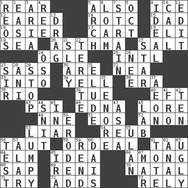 ACROSS 1. Stern 5. In addition 9. Frozen water 12. Having ears or earlike features 14. College mil. group 15. June honoree 16. Flexible twig of a willow tree 17. Haul 18. Biblical high priest 19. Ocean 20. Respiratory problem 23. Table seasoning 24. Stare at amorously 25. International (abbr.) 27. Backtalk 30. "We ___ not amused" (Victoria) 32. Teachers' org. 33. To the inside or interior of 34. Shout 36. Period 38. _ de Janeiro 39. Third day of the wk. 40. Lizard (obsolete) 43. Air pressure measure (abbr.) 46. Pulitzer Prize-winning author Ferber 48. Old wives' tales, e.g. 49. Compass dir. 51. Greek goddess of the dawn 52. At once, immediately (arch.) 53. One who doesn't tell the truth 54. Reuben's nickname 56. Pulled tight 58. Severe or trying experience 61. The 19th letter of the Greek alphabet 64. Shade tree 65. The content of cognition 66. Amid 68. Plant excrement 69. Painter Guido (1575-1642) 70. Relating to or accompanying birth 71. Attempt 72. Sums up 73. Depend DOWN 1. Vintage cars 2. Relaxation 3. Operatic vocal solo 4. To sift 5. Bowlike part 6. Rich soil 7. Put through a sieve 8. Sep. follower 9. Perfect 10. Give a ring to 11. Prepare for publication 13. To be drawn or hauled along 21. Kill 22. Cigar-shaped 23. Play the lead 24. Bear (Spanish) 26. Born 27. Title for a knight 28. Cuckoo 29. Cease 31. Evade 35. Poe poem 37. A really long time 41. Away 42. "___ Little Indians" 44. In a ____ (agitated or irritated) 45. _ tizzy (2 wds.) 47. At sea 48. Experiment locale 50. Eaten away 53. Containing lumps 55. Uhlan (variant) 56. Trial 57. Having or resembling wings 59. Tear apart 60. Raised platform 61. Carryall 62. Of or related to the anus 63. Repulsive 65. Retirement account (abbr.) 67. Third mo.