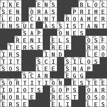 ACROSS 1. Mamie's husband 4. Followers of ems 7. Group of countries in special alliance 11. Elected rep. 12. Mouths or openings 13. First class 14. Directed 15. Patter 16. Nomad 17. Take place subsequently 19. Aide 21. Plant excrement 23. Singles 24. Painter Guido (1575-1642) 25. Raised railways 26. Order of Saint Francis (abbr.) 29. Laconic 30. To riddle 31. 17th letter of the Greek alphabet 32. Big collection agency 33. Working for oneself (abbr.) 34. Lion 35. Teat (slang) 36. _-fi 37. Grain storage towers 40. Mayday 41. Area sheltered from the wind 42. Fastener 43. Examine hastily 45. Ovum 46. Conclusion 51. First name in cosmetics 55. Foolish or stupid persons 56. Republicans 58. Rowing implement 59. Impressive in appearance 60. Remainder 61. Bear (Spanish) 62. Celtic language 63. Biblical high priest 64. French article DOWN 1. Capri or Wight 2. Peachy ____! 3. Conclusions 4. Epoch 5. Nanny 6. Fast planes 7. Naughty children 8. Pale green bean 9. Sign of things to come 10. Sure thing 12. Seas 13. Airs 16. Remove soap 18. One who makes use of a thing 20. Having a sole or soles 22. Sliced dessert 24. Musical pauses 25. Bert's buddy 26. Fourth or lowest deck 27. "______ My Girl" (Turtles hit) 28. Egg _ yung 29. Musical group of three 32. ___ a Wonderful Life 33. Ancient Celtic tribe of eastern Britain 36. Narrow boards 37. Compass dir. 38. Eat 39. Straggles 43. Took without asking 44. Quote 46. Trig term 47. Scent 48. Chest bones 49. Legendary monster 50. Christmas carol 52. Implement 53. Comfort 54. Greek god of love 57. Air pressure measure (abbr.)