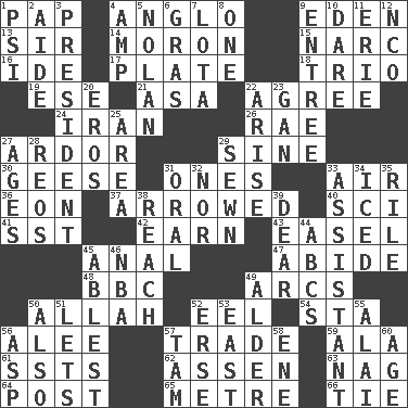 ACROSS 1. Infant food 4. White American of non-Hispanic descent 9. Genesis locale 13. Title for a knight 14. Person of subnormal intelligence 15. Drug cop 16. Binary compound 17. Food holder 18. Musical group of three 19. Compass dir. 21. White ___ sheet 22. Match 24. SW Asia republic 26. Actress Charlotte 27. Zeal 29. Trig term 30. Honkers 31. Singles 33. Wind 36. A really long time 37. Moved like an arrow 40. _-fi 41. Fast jet (abbr.) 42. Merit 43. Artist's stand 45. Of or related to the anus 47. Stay 48. English channel? 49. Arches 50. Assad's deity 52. Snakelike fish 54. R.R. building 56. Toward shelter 57. Swap 59. Chicken ___ king 61. Fast planes 62. NE Netherlands city 63. Tired old horse 64. Mail 65. Distance measurement (Brit.) 66. Make a knot DOWN 1. 23rd letter of the Greek alphabet 2. Helper 3. Elected leader of a country 4. Electrical Unit 5. Pitcher Ryan 6. Pate de foie ____ 7. Globular water bottle used in Asia 8. Single 9. Main course 10. Have the gumption 11. One of the Great Lakes 12. Non-commissioned officer (abbr.) 20. Greek god of love 22. Ascend 23. Separate the seeds from cotton 25. Length times width 27. Eras 28. Vintage cars 29. Stitched 31. Taken by mouth 32. Not either 33. Helper 34. On the rocks 35. Cause heat under the collar 38. Arrive at 39. Letter starter 44. Lettered men learn these first 45. Most capable 46. Basketball assoc. 49. Tree or shrub in the Birch family 50. In addition 51. Allows 52. Celtic language 53. 90 degrees 55. Jai _ 56. Viper 57. Scottish cap 58. Compass dir. 60. Personal question