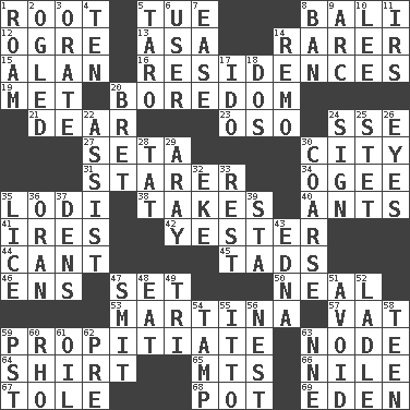 ACROSS 1. Carrot, for example 5. Third day of the wk. 8. Indonesian resort city 12. Legendary monster 13. White ___ sheet 14. More uncommon 15. ____ Jay Lerner 16. Homes 19. Was introduced to 20. Mood resulting from idleness 21. Letter starter 23. Bear (Spanish) 24. Compass dir. 27. Bristle 30. Municipality 31. A viewer who gazes fixedly 34. Double curve, resembling the letter S 35. Farming town in central California 38. Receives possession of 40. Pismires 41. Angers 42. Last 44. Patter 45. Bits 46. Followers of ems 47. Arrange properly for use 50. Actress Patricia 53. Chrissie's court nemesis 57. Large container 59. Conciliate 63. Connecting point 64. Upper-body garment 65. Mountains (abbr.) 66. The longest river in the world 67. Lacquered or enameled metalware 68. Cooking vessel 69. Paradise DOWN 1. Wander aimlessly 2. Stared at amorously 3. Declaim 4. "___ Little Indians" 5. Pacific island yam 6. One who makes use of a thing 7. Comfort 8. Prohibit 9. Curve 10. Area sheltered from the wind 11. Big collection agency 14. San ____ (Riviera town) 17. Wedding promise 18. Two (Sp.) 20. Cy Young winner Saberhagen 22. Help 24. Signal 25. Proofreading order 26. Sight organs 28. Make lace 29. Like ___ of sunshine 30. Rough 32. Make supply last 33. Respite 35. Louse (plural) 36. NW Algerian seaport 37. Habitations of wild animals 39. R.R. building 43. Pulitzer Prize-winning author Ferber 47. Stricken, poetically 48. Consume 49. Three (prefix) 51. Shun 52. Dipping utensil 54. Pack (down) 55. "Tell ____ the Marines!" 56. A home for chicks 58. Adolescent 59. Pacific Standard Time (abbr.) 60. 17th letter of the Greek alphabet 61. Petroleum 62. Before (prefix) 63. Compass dir.