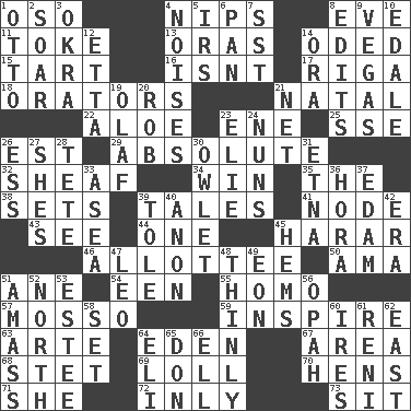 ACROSS 1. Bear (Spanish) 4. Cuts off 8. Night before a holiday 11. Puff or smoke 13. Mouths or openings 14. Wrote a lyric poem 15. Small pie 16. Is not 17. Capital of Latvia 18. Speakers 21. Relating to or accompanying birth 22. _ vera 23. Compass dir. 25. Compass dir. 26. Eastern Standard Time (abbr.) 29. Utter; complete 32. Archer's quiver 34. Victory 35. Definite Article 38. Puts into a specified state 39. Lies 41. Thickened enlargement 43. Observe 44. Single 45. Ethiopian city, capital of Harari 46. One to whom something is allotted 50. Housemaid (var.) 51. A saturated hydrocarbon 54. Car or cant ending 55. Like (prefix) 57. With motion or animation 59. Heighten or intensify 63. Johnson of "Laugh-In" 64. Locale of original sin 67. Length times width 68. Proofreading order 69. Hang loosely or laxly 70. Coop moms 71. A female animal or person 72. In an inward manner 73. Be seated DOWN 1. "Beetle Bailey" pooch 2. Fly high 3. Gumbo ingredient 4. Annoying sounds 5. Big collection agency 6. Baking dish 7. Fast jet (abbr.) 8. Prepares for publication 9. Viva Las _ 10. Peak District village in England 12. Singer James 14. Mouth or opening 19. Norwegian king 20. Director Reiner 21. Remaining after all deductions 23. Writer Wiesel 24. Religious women 26. Curvy letter 27. "______ My Girl" (Turtles hit) 28. False hair 30. A small or young owl 31. Inactive volcano in Sicily 33. At sea 36. Israeli folk dance 37. Dutch treat 39. Lacquered or enameled metalware 40. At once, immediately (arch.) 42. Period 45. Cloth borders 47. Lion 48. Without viscosity 49. Period of immesurable duration 51. Collect or gather 52. 0 degrees 53. First name in cosmetics 56. Brightly colored fish 58. Put into a specified state 60. Angers 61. Painter Guido (1575-1642) 62. 90 degrees 64. Biblical high priest 65. Spanish title 66. Pipe bend
