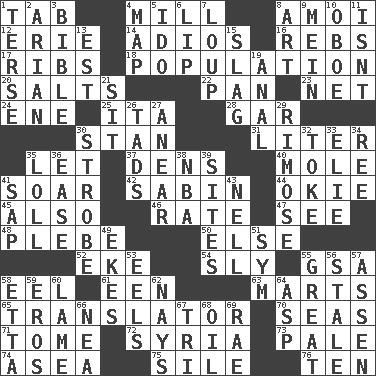ACROSS 1. Bar bill 4. Place where flour is made 8. Mine, in Marseilles 12. 4th largest of the Great Lakes 14. Goodbye (Sp.) 16. Confederate soldiers (slang) 17. Chest bones 18. Census information 20. Table seasonings 22. Baking dish 23. Remaining after all deductions 24. Compass dir. 25. Call ___ day 28. Slender fish 30. Comedian Laurel of Laurel & Hardy 31. 61 cubic inches 35. Allow 37. Habitations of wild animals 40. Undercover agent 41. Fly high 42. Unit of acoustic absorption 44. Migrant worker of the '30s 45. In addition 46. Assign a rank or rating to 47. Perceive with the eye 48. Cadet 50. Otherwise 52. Supplement with great effort 54. Playfully artful 55. Girls' org. (abbr.) 58. Snakelike fish 61. Car or cant ending 63. Shops 65. Interpreter 70. Oceans 71. Heavy book 72. Damascus' land 73. Diluted with white 74. Toward the sea 75. Filth; sediment 76. "___ Little Indians" DOWN 1. Laconic 2. Believer in; advocate of (suffix) 3. God's Word 4. Atlas unit 5. Wedding promise 6. Mouth edge 7. Central Nebraska county 8. Tate display 9. Chow _ 10. Mitch Miller's instrument 11. Is not 13. Eastern Standard Time (abbr.) 15. Volcanic refuse 19. Of or related to the anus 21. Be seated 26. Bits 27. Approach 29. Full of chinks, cracks, or crevices 30. Disco prop 32. Casino tip 33. Writer Wiesel 34. To separate or throw off 35. Hang loosely or laxly 36. Comfort 38. Basketball assoc. 39. Locates 41. Plant excrement 43. 1994 drama film starring Jodie Foster 49. Supplements with great effort 51. Symbol (abbr.) 53. Snakelike fish 55. Relatively large 56. Having lost freshness 57. NE Netherlands city 58. Singer James 59. Greek god of love 60. Unable to walk 62. Negative votes 64. Cleo's killer 66. Teachers' org. 67. Three (prefix) 68. Lubricate 69. Actress Charlotte