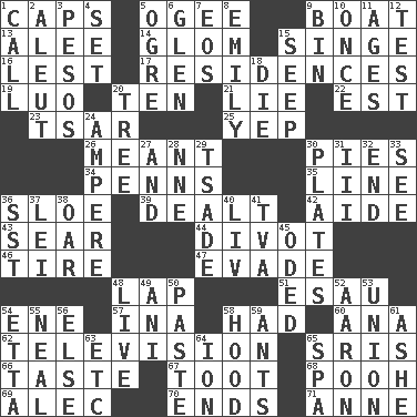 ACROSS 1. Smile enhancers 5. Double curve, resembling the letter S 9. Water vessel 13. Toward shelter 14. Seize upon or latch onto something 15. Burn superficially 16. For fear that 17. Homes 19. Nilotic language 20. "___ Little Indians" 21. Untruth 22. Eastern Standard Time (abbr.) 23. Russian ruler of old 25. Slangy assent 26. Intended 30. Sliced desserts 34. Actor Sean's family 35. Actor's bit 36. A type of plum 39. Started a card game 42. Assistant 43. Scorch 44. A piece of turf (Scot.) 46. Become fatigued 47. Elude 48. Infant locale 51. Son of Isaac 54. Compass dir. 57. _ tizzy (2 wds.) 58. Possessed 60. Santa ___, CA 62. Household entertainment appliance 65. Indian titles of respect 66. Clothes sense 67. A blast of a horn 68. "Silly old bear" 69. Actor Baldwin 70. Conclusions 71. Queen of England 1702-14 DOWN 1. Give a ring to 2. Eskimo relative 3. Mexican monetary units 4. Arrange properly for use 5. Legendary monster 6. Small, secluded valley 7. Greek goddess of the dawn 8. Poet Dickinson 9. Storage container 10. At one time in the past 11. Eras 12. Trial 15. Ooze 18. Pass on 20. Woody plant 24. Electrical Unit 27. Added to 28. Compass dir. 29. Sadhe (variant) 30. Food holders 31. One more than two 32. Conclude 33. Observe 36. Fast jet (abbr.) 37. Flowery wreath 38. Boat paddle 40. 54 in ancient Rome 41. Federal power corp. 45. Wrote a lyric poem 48. Not recorded 49. Black tropical American cuckoo 50. Thick mixture 52. Composer Copland 53. The state of being joined or united 54. Singer James 55. Be tempered by heat 56. Otherwise 58. Parka part 59. Pismires 61. American tennis player Robert 63. And so on (abbr.) 64. Electrically charged atom 65. Health resort