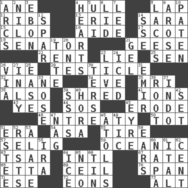ACROSS 1. A saturated hydrocarbon 4. Frame or body of a ship 8. Infant locale 11. Chest bones 13. 4th largest of the Great Lakes 14. "Two Mules for Sister ____" 15. Hoof sound 16. Helper 17. Native of Scotland 18. Legislator 21. Honkers 22. Monthly bill 23. Untruth 25. Elected rep. 26. Compete 29. One of the two male reproductive glands 32. Empty; void 34. First lady 35. Medical imaging device (abbr.) 38. In addition 39. Tear up 41. Charged particles 43. It is so 44. Mayday 45. Wear away 46. Plea 50. Small child 51. Period 54. White ___ sheet 55. Hoop that covers a wheel 57. Major League Baseball Commissioner Bud 59. Pertaining to the sea 63. Russian ruler of old 64. International (abbr.) 67. Pace 68. Singer James 69. To provide with a ceiling 70. Connect, as a bridge 71. Compass dir. 72. Immeasurably long periods of time 73. The first octave above the treble staff DOWN 1. Arches 2. "Death on the ____" 3. Inky black, to poets 4. Centers of feelings and intuitions 5. RI univ. 6. Hat (slang) 7. Area sheltered from the wind 8. Shoestrings 9. Came up 10. Eucharist need 12. Practice fight 14. Compass dir. 19. False hair 20. Single 21. Set 23. Moving, as bait 24. On the rocks 26. By way of 27. In an inward manner 28. Relaxation 30. Laconic 31. Independent ruler or chieftain 33. Olfactory organ 36. Carrot, for example 37. Southeast Asian peninsula 39. Fast planes 40. Israeli folk dance 42. Arrange properly for use 45. Jane of fiction 47. Tired old horse 48. Ringlike coral islands and reefs 49. Nervous spasm 51. First name in cosmetics 52. Musical pauses 53. Having winglike extensions 56. Hearing organs 58. Lyricist Gershwin 60. California wine valley 61. Slanted text style (abbr.) 62. Penny 64. Frozen water 65. Modern: prefix 66. Shallow baking pan