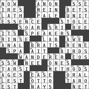 ACROSS 1. Immediately 4. At once, immediately (arch.) 8. Compass dir. 11. Angers 13. Count _ (2 wds.) 14. Antes 15. Thin strip of wood or metal 16. Diluted with white 17. A single undivided whole 18. Substance 21. Took without asking 22. Fly high 23. Indian title of respect (Mr.) 25. Portuguese money of account (variant) 26. It is 29. Orators 32. Wash lightly 34. Experiment locale 35. Deep reverence 38. Of or related to the anus 39. Naughty children 41. French philosopher Descartes 43. Health resort 44. Small island 45. Avian creatures 46. Nomad 50. Greek goddess of the dawn 51. Compass dir. 54. Born 55. Singles 57. Tarsus (plural) 59. Modes 63. Eons 64. Comfort 67. Spoken 68. For fear that 69. "Beetle Bailey" pooch 70. Pacific island yam 71. Eastern Standard Time (abbr.) 72. Negative votes 73. Fish or hair follower DOWN 1. "Death on the ____" 2. Mouths or openings 3. Moistens 4. Electrical Unit 5. Teachers' org. 6. Petroleum 7. Compass dir. 8. Sir (Sp.) 9. Vertical member of a panel or frame 10. First name in cosmetics 12. "______ My Girl" (Turtles hit) 14. On the contrary 19. Characteristic smell of wine 20. Head covering 21. Title for a knight 23. Three-handed card game 24. Confederate soldiers (slang) 26. Retirement account (abbr.) 27. Metal containers 28. Fastener 30. Having winglike extensions 31. Indian skirt 33. Cole _ (cabbage dish) 36. Past tense of be (plural) 37. Inside; within (prefix) 39. Object of repulsion 40. Travel on an animal 42. Double-curved letter 45. Cy Young winner Saberhagen 47. Cuckoo 48. Lover boys 49. Compass dir. 51. Lacking originality or spontaneity 52. Gurus 53. Obtain by seizing forcibly or violently 56. Attempt 58. Fast jet (abbr.) 60. Northwest Algerian city 61. Have the gumption 62. Notch 64. Period of immesurable duration 65. "One Day ___ Time" 66. Filthy place