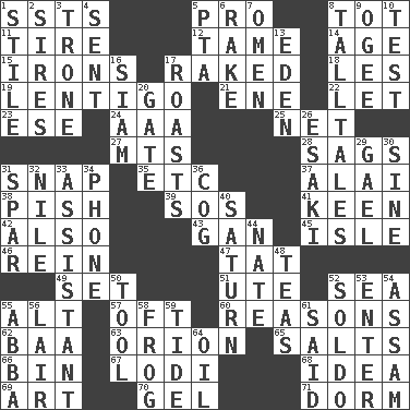 ACROSS 1. Fast planes 5. Adept person 8. Small child 11. Become fatigued 12. Docile 14. Mature 15. Metal shackles 17. Swept the length of 18. French article 19. Small, flat, pigmented spot on the skin 21. Compass dir. 22. Allow 23. Compass dir. 24. American Automobile Association (abbr.) 25. Fish or hair follower 27. Mountains (abbr.) 28. Settles 31. Fastener 35. And so on (abbr.) 37. Mountain range southwest of Kyrgyzstan 38. Expression of disdain 39. Distress signal 41. Peachy ____! 42. In addition 43. Separate the seeds from cotton 45. Small island 46. It's straight from the horse's mouth 47. Make lace 49. Arrange properly for use 51. Shoshoni 52. Ocean 55. The first octave above the treble staff 57. Often (poetically) 60. Thinks logically 62. Sound made by sheep 63. Constellation of myth 65. Table seasonings 66. Storage container 67. Farming town in central California 68. The main thing one is thinking about 69. Nonscientific branch of learning 70. Set 71. Dormintory (informal) DOWN 1. Vertical member of a panel or frame 2. Titles for men of rank and authority 3. Marketplace scale 4. Emitted 5. Parent Teacher Assoc. 6. Libertine 7. Presage 8. Baron Munchausen's specialties 9. Double curve, resembling the letter S 10. Trial 13. Paradise 16. Thailand, formerly 17. Ridicules or criticizes harshly 20. Yard entry 26. 1973 Nobel Price Winner (Physics) Leo 29. Highlander 30. Trig term 31. Coast Guard woman 32. The longest river in the world 33. Aide 34. Give a jingle 36. Gear tooth 40. Titan orbits this 44. Nathan's nickname 48. Beverages made from leaves 50. Instrument 52. Twentieth part of a lira 53. Keyboard key 54. Indian state 55. Swedish rock group 56. Den 58. Toadlike animal 59. Event that recurs at intervals 61. Stated 64. Lubricate
