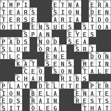 ACROSS 1. Body of Kaffir warriors 5. Inactive volcano in Sicily 9. Epoch 12. Lacerates 14. The Jewish people; Israel 15. Lair 16. Laconic 17. Operatic vocal solo 18. Wedding promise 19. Baseball player Mel 20. Takes place subsequently 23. Portico 24. Connect, as a bridge 25. Sight organs 27. Writing tablets 30. Lower and raise head in agreement 32. Ocean 33. Turn sharply 34. Spoken 36. Indian title of respect (Mr.) 38. Affectionate concern, for short 39. Compass dir. 40. Spanish title 43. Krazy ___ of comics 46. Elected reps. 48. Chow _ 49. Corporate head (abbr.) 51. Male child 52. Story 53. Burn to charcoal 54. Teases 56. Shaw product 58. Keyboard key 61. For each 64. Electrically charged atom 65. Actor Lugosi 66. Maternal 68. Begley and Asner 69. Water falling in drops from the sky 70. Musical pauses 71. Be seated 72. Cassini of fashion 73. Not this but _ DOWN 1. "Tell ____ the Marines!" 2. Confront 3. Piece 4. Big collection agency 5. He sold his birthright 6. Hoop that covers a wheel 7. Annoying sounds 8. Santa ___, CA 9. Proofreads 10. Make new 11. Small Philippine buffalo 13. Ooze 21. Billionth: prefix 22. Sounds asleep 23. Burn superficially 24. Compass dir. 26. Affirmative reply 27. Pacific Standard Time (abbr.) 28. Everything 29. Evade 31. Natives or inhabitants of Denmark 35. Poe poem 37. It may be bright or harebrained 41. Lubricate 42. Compass dir. 44. Painful 45. Beverage made from leaves 47. In a ____ (agitated or irritated) 48. Mountains (abbr.) 50. Severe or trying experience 53. 2nd pers. sing. pres. of can (arch.) 55. Fermented drink made from hops 56. Sliced desserts 57. Farming town in central California 59. Writer Wiesel 60. Long (Scottish) 61. Romantic infatuation 62. Singer James 63. Take ten 65. Sis' sibling 67. Fish or hair follower