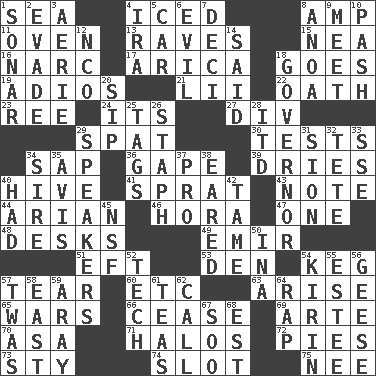 ACROSS 1. Ocean 4. On the rocks 8. Electrical Unit 11. Baking chamber 13. All-night dance parties 15. Teachers' org. 16. Drug cop 17. N. Chile seaport 18. Moves 19. Goodbye (Sp.) 21. Cards in a Roman deck? 22. Pledge 23. To sift 24. It is 27. HTML Container Element 29. Petty quarrel 30. Trials 34. Plant excrement 36. Yawn 39. Frees from moisture 40. Hub of activity 41. Small fatty European fish 43. Musical sound 44. Believer in; advocate of (suffix) 46. Israeli folk dance 47. Single 48. Writing tables 49. Arab leader 51. Bank Draft (abbr.) 53. Lair 54. Barrel 57. Pull apart 60. And so on (abbr.) 63. Ascend 65. Armed conflicts 66. Stop 69. Johnson of "Laugh-In" 70. White ___ sheet 71. Auras 72. Sliced desserts 73. Filthy place 74. Slit 75. Born DOWN 1. Underwater navigation system 2. Dodge 3. Nest on high 4. Retirement account (abbr.) 5. 4-wheeled motor vehicle 6. Morally bad or wrong 7. Tenth: prefix 8. Small Philippine buffalo 9. Rendezvous 10. Romantic infatuation 12. Non-commissioned officer (abbr.) 14. Alleged 18. Head of state? 20. Small drink 25. Labels 26. Staphylococcus 28. It would 29. Orators 31. The Jewish people; Israel 32. Wig 33. Compass dir. 34. The founder of a family 35. Opinion 37. Adept person 38. Having ears or earlike features 40. Possessed 42. Docile 45. Science/research agcy. 50. _ tizzy (2 wds.) 52. Technician 54. Japanese brewing company 55. First name in cosmetics 56. Honkers 57. It was, poetically 58. Compass direction 59. Like ___ of sunshine 61. Beverages made from leaves 62. Give a ring to 64. Hit sharply and swiftly 67. "Barney Miller" actor Jack 68. Eastern Standard Time (abbr.)