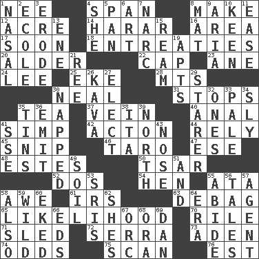 ACROSS 1. Born 4. Connect, as a bridge 8. Cause to be 12. 1/640 square mile 14. Ethiopian city, capital of Harari 16. Type of rug 17. Within a short period 18. Pleas 20. Tree or shrub in the Birch family 22. Head covering 23. A saturated hydrocarbon 24. Area sheltered from the wind 25. Supplement with great effort 28. Mountains (abbr.) 30. Be tempered by heat 31. Ceases 35. Afternoon social gathering 37. Distinctive style or manner 40. Of or related to the anus 41. Simple or foolish person 42. 13-14th century defensive garment 44. Have confidence or faith in 45. Sever or remove by pinching or nipping 46. Edible starchy tuberous root 47. Compass dir. 48. _____ Park, CO 50. Russian ruler of old 52. Two (Sp.) 54. Layer 55. "One Day ___ Time" 58. Deep reverence 61. Big collection agency 63. Debunk (Brit. slang) 65. Odds 70. Cause heat under the collar 71. Downhill vehicle 72. Father Junipero _ 73. Arabian gulf 74. Probability 75. Glance over 76. Eastern Standard Time (abbr.) DOWN 1. Relating to the nose 2. Learning spot: Fr. 3. Eat (away) 4. A female animal or person 5. Baking dish 6. Tate display 7. Drug cop 8. Floor covering 9. Roberta Peters solo 10. Peachy ____! 11. Relaxation 13. Compass dir. 15. 480, 500 or 516 sheets of paper 19. Tenement units (abbr.) 21. To riddle 26. Polynesian shrub of the pepper family 27. Opt 29. A viewer who gazes fixedly 30. Slept 32. Singles 33. Light colored 34. Roguish 35. Metal containers 36. Give off 38. Call ___ day 39. 0 degrees 41. Compass dir. 43. Characteristic smell of wine 49. The visible part of the earth's surface 51. Also 53. Indian titles of respect 55. Remain 56. Stories 57. Rep 58. In addition 59. Uncontrolled 60. Supplemented with great effort 62. "______ My Girl" (Turtles hit) 64. Epoch 66. Begley and Asner 67. The grampus (Milton) 68. Mouth or opening 69. Daniel's nick name