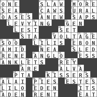 ACROSS 1. Single 4. Cole _ (cabbage dish) 8. Greater amount 12. Ocean 13. Crow sounds 14. Mountain range 15. Fertile tracts in a desert 18. Afresh 19. Plant excrements 20. Imposing or collecting, as a tax 22. Commissioned mil. rank 23. For fear that 24. Put into a specified state 25. R.R. building 26. Electrical Measurement 30. "Barney Miller" actor Jack 33. Ms. Damita and namesakes 36. Inky black, to poets 37. Among 39. Teachers' org. 40. Downhill vehicle 41. French philosopher Descartes 42. White American of non-Hispanic descent 44. Curvy letter 45. Short socks 47. Marina Del _, California 50. "We ___ not amused" (Victoria) 51. Inventor's middle name 53. Parent Teacher Assoc. 54. Smoochers 57. Mountain range southwest of Kyrgyzstan 59. Sliced desserts 61. _____ Park, CO 63. _ and Stitch 64. Locale of original sin 65. ___ a Wonderful Life 66. An important port of Yemen 67. Monthly bill 68. Consume DOWN 1. Bear (Spanish) 2. Actress Patricia 3. Artist's stand 4. Examine hastily 5. Austrian-born American filmmaker Fritz 6. Deep reverence 7. Compass dir. 8. French bagpipes 9. Northwest Algerian city 10. Reproach for some lapse or misdeed 11. Raised railways 16. Nights before holidays 17. System (abbr.) 21. Slanted text style (abbr.) 22. Set 24. Distress signal 26. Small bottle 27. Competent 28. Moves 29. Conclusions 30. "Two Mules for Sister ____" 31. Presage 32. Pig sound 34. Taverns 35. Part of a journey 38. Accusation by an informer 42. Had dinner 43. Mouths or openings 46. Epoch 48. Otherwise 49. Jacques Cousteau's middle name 52. Nick name for Arthur 53. Light colored 54. Peachy ____! 55. Is not 56. Bristle 57. According to 58. Hat (slang) 59. For each 60. Binary compound 62. Fast jet (abbr.)