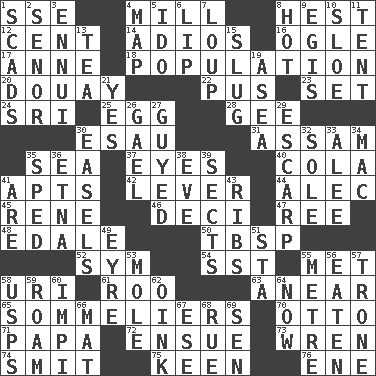 ACROSS 1. Compass dir. 4. Place where flour is made 8. Command 12. Penny 14. Goodbye (Sp.) 16. Stare at amorously 17. Singer Murray 18. Census information 20. A city in N France, SE of Calais 22. Fluid product of inflammation 23. Arrange properly for use 24. _ Lanka 25. Oval reproductive body of a fowl 28. Unit of force equal to gravity 30. He sold his birthright 31. Indian state 35. Ocean 37. Snake ____ (dice throw) 40. Root beer relative 41. Tenement units (abbr.) 42. Crowbar 44. Actor Baldwin 45. French philosopher Descartes 46. Tenth: prefix 47. To sift 48. Peak District village in England 50. Cook's measure (abbr.) 52. Symbol (abbr.) 54. Fast jet (abbr.) 55. Was introduced to 58. RI univ. 61. Friend of Pooh 63. Approach 65. Wine waiters 70. "Beetle Bailey" pooch 71. Dad 72. Take place subsequently 73. Songbird 74. Stricken, poetically 75. Peachy ____! 76. Compass dir. DOWN 1. Large numbers or amounts 2. Sir (Sp.) 3. World-weariness 4. Atlas unit 5. Wedding promise 6. Mouth edge 7. Central Nebraska county 8. Being at a high temperature 9. Armor plate that protects the chest 10. A type of plum 11. Portable shelter 13. Afternoon social gathering 15. A hard, heavy blow 19. At sea 21. It is so 26. Highlander 27. Secured 29. Fortification 30. Artist's stands 32. Flatfish 33. Toward shelter 34. Big _ 35. Moved rapidly 36. Inactive volcano in Sicily 38. First lady 39. Religious groups 41. "We ___ not amused" (Victoria) 43. Chest bones 49. Jane of fiction 51. R.R. building 53. Undercover agent 55. Distance measurement (Brit.) 56. Eroded 57. Heavy duty weighing machine 58. United States Postal Service (abbr.) 59. Wander aimlessly 60. Body of Kaffir warriors 62. Pig sound 64. Immediately 66. Floor protector 67. Compass dir. 68. Regret 69. Elected rep.