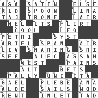 ACROSS 1. White ___ sheet 4. Smooth fabric 9. Otherwise 13. To free from 14. Soup utensil 15. Pale green bean 16. _ Mahal 17. Heavy duty weighing machine 18. Den 19. Cartoonist voice _ Blanc 21. It is 22. Talk or behave amorously 24. Calm and collected 26. Lion 27. _ dish (used to culture cells) 29. System (abbr.) 30. Satellite of Uranus 31. Connect, as a bridge 33. Atmosphere 36. 54 in ancient Rome 37. Catching in a trap 40. Indian title of respect (Mr.) 41. Observe 42. Actor Baldwin 43. Indian state 45. Compass direction 47. Aches 48. Keyboard modifier key 49. Antes 50. Chummy 52. Single; one (prefix) 54. Call ___ day 56. Highlander 57. First-year military academy student 59. Santa ___, CA 61. _ vera 62. Travels by water 63. Lower and raise head in agreement 64. Monthly bill 65. An arm off of a larger body of water 66. Bit DOWN 1. Tate display 2. Thailand, formerly 3. Descriptive word 4. Fast jet (abbr.) 5. Showery time 6. A blast of a horn 7. Charged particles 8. Compass dir. 9. American author Paul (1891-1958) 10. One who doesn't tell the truth 11. Stricken, poetically 12. Ewer handle 20. Old wives' tales, e.g. 22. Film actor Errol 23. French article 25. Lubricates 27. Friends 28. One of the Great Lakes 29. Ketch in the Levant 31. Table seasoning 32. Before (prefix) 33. Helper 34. SW Asia republic 35. Basketball hoops 38. Smutty 39. Stare wonderingly 44. Suttee (variant) 45. Place for singles 46. Pipe bend 49. Instruction Manual for Humans 50. Diluted with white 51. Period of immesurable duration 52. Uhlan (variant) 53. Famous astronaut Armstrong 55. Small Philippine buffalo 56. Slender fish 57. 23rd letter of the Greek alphabet 58. Eastern Standard Time (abbr.) 60. Say or write further