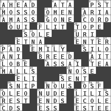 ACROSS 1. At or in the front 6. _ moment's notice (2 wds.) 9. Pacific Standard Time (abbr.) 12. With motion or animation 13. Sign of something about to happen 14. Operatic vocal solo 15. Collect or gather 16. Went 17. Drawstring 18. Fr. "Yes" 19. Secret move to avoid paying debts 20. Drink excessively 21. Flatfish 23. RI univ. 24. Inactive volcano in Sicily 25. Keyboard key 28. Groovy apt. 30. Poet Dickinson 34. Grain storage tower 35. Black tropical American cuckoo 36. A special lineage 38. Small island 39. Ear part 41. Slender Brazilian palm 43. Afternoon social gathering 44. Shopping centers 46. Olfactory organ 48. Connecticut Ivy Leaguer 49. Emitted 50. Sever or remove by pinching or nipping 51. Horse sense 53. Order of Saint Francis (abbr.) 56. Margarine 57. Unadorned 58. Ms. Damita and namesakes 60. Respite 61. Extremities 62. Learning spot: Fr. 63. Music discs 64. Curvy letter 65. First name in cosmetics DOWN 1. Housemaid (var.) 2. Same (prefix) 3. He sold his birthright 4. Help 5. Two (Sp.) 6. Mine, in Marseilles 7. Portable shelter 8. A saturated hydrocarbon 9. Appease 10. Beget 11. Small amount or degree 13. Stare 14. Oak nuts 19. Flambe (short form) 20. Third day of the wk. 22. Single 24. The property of being fit to eat 26. Writer Wiesel 27. Round or rotation of duties 28. Inside of hand 29. Small Philippine buffalo 31. Retirement account (abbr.) 32. French article 33. Consenting reply 37. Natives or inhabitants of Denmark 40. American author Paul (1891-1958) 42. Electrically charged atom 45. Small drink 47. Unemotional ones 49. Takes to court 50. Downhill vehicle 51. Religious women 52. Probability 54. Narrow opening 55. Do some clerical work 56. The grampus (Milton) 57. Born 58. Area sheltered from the wind 59. Observe