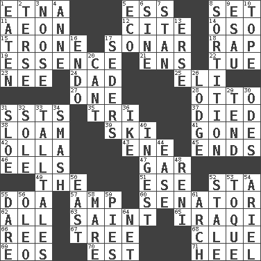 ACROSS 1. Inactive volcano in Sicily 5. Double-curved letter 8. Arrange properly for use 11. Period of immesurable duration 12. Quote 14. Bear (Spanish) 15. Heavy duty weighing machine 17. Underwater navigation system 18. Hit sharply and swiftly 19. Core 21. Followers of ems 22. Third day of the wk. 23. Born 24. Male parent 25. Biblical high priest 27. Single 28. "Beetle Bailey" pooch 31. Fast planes 35. Three (prefix) 37. Passed on 38. Rich soil 39. What Jean-Claude Killy likes to do 41. Went 42. Water jar 43. Compass dir. 45. Conclusions 46. Snakelike fish 47. Slender fish 49. Definite Article 51. Compass dir. 52. R.R. building 55. ___ good deed 57. Electrical Unit 60. Legislator 62. Everything 63. Inhabitant of Heaven 65. Resident of Iraq 66. Portuguese money of account (variant) 67. Family _ (genealogy) 68. A slight indication 69. Greek goddess of the dawn 70. Eastern Standard Time (abbr.) 71. The bottom of a shoe or boot DOWN 1. Ingested 2. Laconic 3. Trap for birds or small mammals 4. Singer Murray 5. Environmental prefix 6. Trig term 7. Comedian Laurel of Laurel & Hardy 8. Casting lots 9. Son of Isaac 10. Drink excessively 13. Celtic language 16. Inside; within (prefix) 17. Spring feasts 20. Patter 26. Cabin 29. Watch over 30. Lyric poems 31. _ gin 32. Flatfish 33. Baron Munchausen's specialties 34. Box-office sellout 36. Eisenhower's nickname 40. Swallow 44. Relaxation 48. Painter Guido (1575-1642) 50. Compass direction 52. Showing deterioration from age 53. Woman's close-fitting hat 54. Satellite of Uranus 55. Have the gumption 56. Butter sub 58. Female horse 59. Sliced desserts 61. Bowlike part 64. Remaining after all deductions