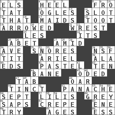 ACROSS 1. Raised railways 4. The bottom of a shoe or boot 8. From 11. Make lace 12. Stares 14. Narrow opening 15. Not this but _ 17. Women servants 18. A blast of a horn 19. Moved like an arrow 21. Take or capture by force 23. French article 24. ___ a Wonderful Life 25. Collude with 27. Among 30. "___ Maria" 31. Sounds asleep 34. Science/research agcy. 37. Teat (slang) 38. Satellite of Uranus 39. According to 40. Begley and Asner 41. Soft color 43. Nine, plus one 44. Object of repulsion 45. Wrote a lyric poem 47. Keyboard key 49. Boat paddle 50. Colored lightly or faintly 52. Flamboyance 56. Back-to-school mo. 57. Ms. Damita and namesakes 60. Jennifer or Joel 61. Plant excrements 62. Streamer paper 63. Compass dir. 64. Attempt 65. Matures 66. Curvy letter DOWN 1. Singer James 2. Cowardly lion portrayer 3. Play the lead 4. Dwellings 5. Mild oath 6. Biblical high priest 7. Directed 8. Soft thread for cleaning between teeth 9. Carrot, for example 10. Baseball player Mel 13. Compass dir. 14. Proofreading order 16. Lacquered or enameled metalware 20. Moistens 22. To free from 25. Enthusiastic 26. Wagers 27. Originate 28. Rendezvous 29. Capri or Wight 30. Had dinner 32. California wine valley 33. Northwest Algerian city 34. Nathan's nickname 35. Downhill vehicle 36. Avid follower 42. Grant temporary use of 44. English channel? 46. To trail on the ground 47. Likely to tip or tilt 48. Pismires 49. Fertile tracts in a desert 50. Lacerate 51. Affectionate concern, for short 52. Corncob 53. Algonquian 54. Coop moms 55. Sight organs 56. Fast jet (abbr.) 58. Lyricist Gershwin 59. Part of a journey