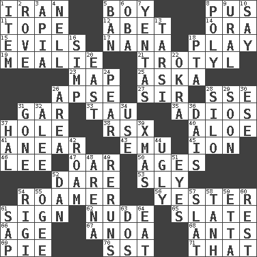 ACROSS 1. SW Asia republic 5. Male child 8. Product of festering 11. Drink excessively 12. Collude with 14. Mouth or opening 15. Vices 17. Grandmother 18. Live dramatic performance 19. Ear of corn 21. Trinitrotoluene 23. Atlas unit 25. "____ silly question..." 26. Domed church section 27. Title for a knight 28. Compass dir. 31. Slender fish 33. The 19th letter of the Greek alphabet 35. Goodbye (Sp.) 37. Hollow 38. Acura sports coupe 40. _ vera 41. Approach 43. Australian flightless bird 45. Electrically charged atom 46. Area sheltered from the wind 47. Boat paddle 50. Matures 52. Have the gumption 53. Wily 54. Wanderer 56. Last past 61. Attach a signature 62. Unadorned 65. Schedule 66. Ripen 67. Small Philippine buffalo 68. Pismires 69. Sliced dessert 70. Fast jet (abbr.) 71. Not this but _ DOWN 1. A distinct part 2. Be footloose 3. Capital of Western Samoa 4. 1994 drama film starring Jodie Foster 5. Bar 6. Chief or king in Benin or Nigeria 7. Gossips 8. Much (prefix) 9. Mountain range 10. Declare 13. Tarsus (plural) 16. Simple or foolish person 18. Parent Teacher Association (abbr.) 20. Compass direction 22. Gumbo ingredient 24. Lightbulb-shaped fruit 26. Type of rug 28. Grain storage tower 29. Within a short period 30. Compass dir. 31. Went 32. Toward shelter 34. Purpose 36. Raised platform 37. Actor Linden 39. Dec. holiday 42. Wander aimlessly 44. Repulsive 48. Sports stadium 49. Summer TV shows 51. Snake ____ (dice throw) 52. One of the 12 tribes of Israel 54. Swiss mountan, "Queen of the Mountains" 55. Double curve, resembling the letter S 57. Narrow board 58. Hyperbolic tangent 59. Singer James 60. Repose 61. Plant excrement 63. Two (Sp.) 64. Erode