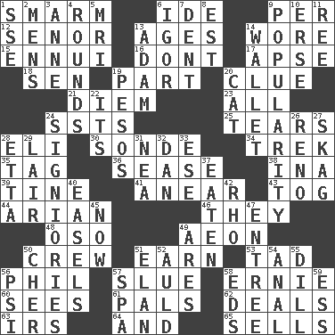 ACROSS 1. Excessive but superficial compliments 6. Binary compound 9. For each 12. Sir (Sp.) 13. Ripens 14. Had on 15. World-weariness 16. Do not 17. Domed church section 18. Elected rep. 19. Component 20. A slight indication 21. South Vietnam president (1954) 23. Everything 24. Fast planes 25. Pulls apart 28. Connecticut Ivy Leaguer 30. Something which is sent 34. Long journey 35. Label 36. Gospel singer Marvin 38. _ tizzy (2 wds.) 39. Prong on a fork 41. Approach 43. Coat; cloak 44. Believer in; advocate of (suffix) 46. Those people 48. Bear (Spanish) 49. Period of immesurable duration 50. Group working together 51. Merit 53. Bit 56. Silvers or Donahue 57. Turn sharply 58. Bert's buddy 60. Observes 61. Friends 62. Allots cards 63. Big collection agency 64. Also 65. Makes a sale DOWN 1. Compass dir. 2. Not women's 3. Singer Murray 4. Periods in a boxing match 5. Medical imaging device (abbr.) 6. Composer Stravinsky 7. Gouge 8. Eastern Standard Time (abbr.) 9. Teen's desire 10. Celtic language 11. To sift 13. First man 14. Place for singles 19. Mexican monetary units 20. Feline 22. ___ a Wonderful Life 24. Seigniories (variant) 26. Former U.S. Attorney General Janet 27. Heroin 28. Singer James 29. Den 31. Teachers' org. 32. One of the 12 tribes of Israel 33. Compass dir. 37. Consumed 40. Artist's stands 42. 17th letter of the Greek alphabet 45. At this time 47. Main course 49. Ancient Greek god of war 50. "Mermaids" star 51. Flair 52. Old (Scot.) 54. Of or related to the anus 55. Deli pickle 56. Air pressure measure (abbr.) 57. Health resort 58. Begley and Asner 59. Double-curved letter