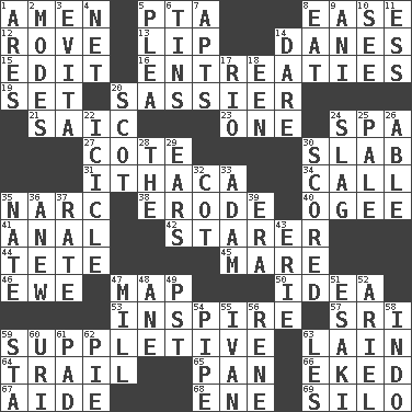 ACROSS 1. So be it 5. Parent Teacher Assoc. 8. Relaxation 12. Be footloose 13. Mouth edge 14. Natives or inhabitants of Denmark 15. Prepare for publication 16. Pleas 19. Put into a specified state 20. More disrespectful 21. Ketch in the Levant 23. Single 24. Health resort 27. ____ d'Azur (French Riviera) 30. Thick slice 31. New York city 34. Give a ring to 35. Drug cop 38. Wear away 40. Double curve, resembling the letter S 41. Of or related to the anus 42. A viewer who gazes fixedly 44. Wig 45. Female horse 46. She-sheep 47. Atlas unit 50. It may be bright or harebrained 53. Motivate 57. Indian title of respect (Mr.) 59. Supplying deficiencies 63. (Had) reclined 64. Lag or linger behind 65. Baking dish 66. Made supply last 67. Assistant 68. Compass dir. 69. Grain storage tower DOWN 1. Ancient Greek god of war 2. Methods 3. Webber/Rice musical 4. Remaining after all deductions 5. Entreaty 6. Canisters 7. Tenement units (abbr.) 8. Erode 9. Black tropical American cuckoo 10. Observe 11. Curvy letter 14. Have the gumption 17. _ de Janeiro 18. Car or cant ending 20. Highlander 22. Ice on the eave 24. Volcanic refuse 25. Light colored 26. Competent 28. Definite Article 29. Hearing organs 30. Tallied 32. Small bed 33. First of billions? 35. Nathan's nickname 36. Afresh 37. Assign a rank or rating to 39. Period 43. 4th largest of the Great Lakes 47. Place where flour is made 48. One (Scot) 49. Pacific Standard Time (abbr.) 51. 1973 Nobel Price Winner (Physics) Leo 52. Satellite of Uranus 54. Corncob 55. _ the terrible 56. French philosopher Descartes 58. _ china 59. R.R. building 60. RI univ. 61. Writing tablet 62. Sliced dessert 63. French article