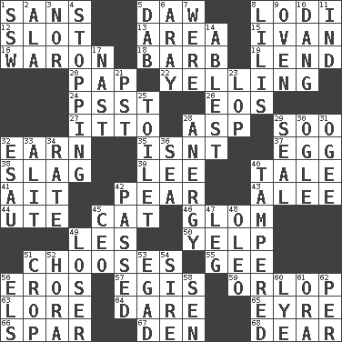 ACROSS 1. Without 5. Obsolete 8. Farming town in central California 12. Narrow, elongated depression 13. Length times width 15. "Terrible" tsar 16. Make _____ (do battle with) 18. Sharp remark 19. Grant temporary use of 20. Infant food 22. Crying or shouting loudly 24. Inconspicuous attention getter 26. Greek goddess of the dawn 27. "Tell ____ the Marines!" 28. Cleo's killer 29. "Barney Miller" actor Jack 32. Merit 35. Is not 37. Oval reproductive body of a fowl 38. Volcanic refuse 39. Area sheltered from the wind 40. Story 41. Small island 42. Lightbulb-shaped fruit 43. Toward shelter 44. Shoshoni 45. Domesticated feline 46. Take by theft 49. French article 50. Sharp bark 51. Elects 55. Turn to the right 56. Greek god of love 57. Armor plate that protects the chest 59. Fourth or lowest deck 63. Old wives' tales, e.g. 64. Have the gumption 65. Jane of fiction 66. Practice fight 67. Lair 68. Letter starter DOWN 1. Compass dir. 2. In the manner of 3. And not 4. Obstructing or blocking passage 5. Small moist lump or mass 6. Like ___ of sunshine 7. Past tense of be (plural) 8. Ms. Damita and namesakes 9. Baking chamber 10. Mild oath, euphamism for damn 11. Working for oneself (abbr.) 14. Most capable 17. Political cartoonist Thomas 21. Pacific Standard Time (abbr.) 23. Trim (branches) 25. Bathroom 28. Disorder of the immune system 29. Lick closed 30. Stare 31. Double curve, resembling the letter S 32. He sold his birthright 33. Came down and settled, as after flight 34. Assign a rank or rating to 36. Ocean 40. ________ with (broke a safety seal) 42. Went by 45. Corporate head (abbr.) 47. Part of a journey 48. Butter sub 49. Failure 51. Riding implement 52. Israeli folk dance 53. Mild oath 54. Male parent of an animal 56. Raised railways 58. Elected rep. 60. Sodium hydroxide 61. Mouth or opening 62. For each