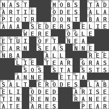 ACROSS 1. Political cartoonist Thomas 5. Disorderly crowds 9. Small amount or degree 12. Nick name for Arthur 14. Lyric poems 15. In the manner of 16. Peter (Polish) 17. Do not 18. Soap unit 19. American Automobile Association (abbr.) 20. Spring feasts 23. Writer Wiesel 24. Past tense of be (plural) 25. Stare 27. Needle holder 30. Often (poetically) 32. Teachers' org. 33. Merit 34. Oceans 36. Compass dir. 38. Basketball assoc. 39. Everything 40. Portuguese money of account (variant) 43. Untruth 46. Rend 48. Pate de foie ____ 49. Mayday 51. R.R. building 52. Fast planes 53. Queen of England 1702-14 54. Singer James 56. Table seasoning 58. Eats (away) 61. Experiment locale 64. Connecticut Ivy Leaguer 65. Wrote a lyric poem 66. Originate 68. Shallow baking pan 69. Tear apart 70. Indian princess (variant) 71. Had dinner 72. Ancient Greek god of war 73. Lightbulb-shaped fruit DOWN 1. California wine valley 2. Roberta Peters solo 3. Portico 4. Teat (slang) 5. Method 6. Aroma 7. Gillaume's butler role 8. Fast jet (abbr.) 9. Eating place 10. Mountain range southwest of Kyrgyzstan 11. Have the gumption 13. Celtic language 21. Greek god of love 22. Outscore 23. Liveliness 24. Victory 26. Commissioned military rank (abbr.) 27. Car or cant ending 28. Bar bill 29. Mountain range 31. Lies 35. Scheduled 37. Blunders 41. Consume 42. Double-curved letter 44. Is not 45. A really long time 47. Assign a rank or rating to 48. Girls' org. (abbr.) 50. Sowing specialist 53. Place in a line 55. Russian ruler of old 56. Stalk of a moss capsule 57. Came down and settled, as after flight 59. French philosopher Descartes 60. Likelihood 61. Actor's bit 62. Toward the sea 63. Fermented drink made from hops 65. Mouth or opening 67. Strike