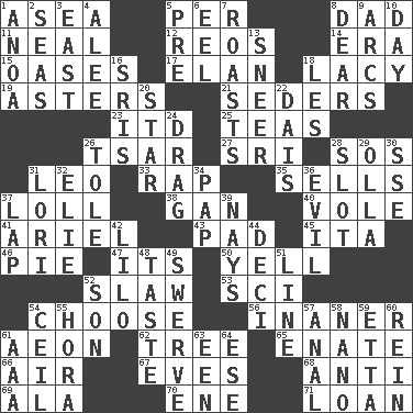 ACROSS 1. Toward the sea 5. For each 8. June honoree 11. Anneal 12. Vintage cars 14. Epoch 15. Fertile tracts in a desert 17. Style 18. Made of lace 19. Michaelmas daisies 21. Spring feasts 23. It would 25. Afternoon social gatherings 26. Russian ruler of old 27. Indian title of respect (Mr.) 28. Mayday 31. Lion 33. Reproach for some lapse or misdeed 35. Exchanges for money 37. Hang loosely or laxly 38. Separate the seeds from cotton 40. Short-tailed, large-bodied rat 41. Satellite of Uranus 43. Writing tablet 45. Call ___ day 46. Sliced dessert 47. ___ a Wonderful Life 50. Shout 52. Cole _ (cabbage dish) 53. _-fi 54. Opt 56. More lacking in sense or substance 61. A really long time 62. Woody plant 65. Maternal 66. Atmosphere 67. Nights before holidays 68. Against 69. According to 70. Compass dir. 71. Grant temporary use of DOWN 1. Small Philippine buffalo 2. Oceans 3. 90 degrees 4. Toward shelter 5. Before (prefix) 6. Snakelike fish 7. Exposes to great heat 8. Letter starter 9. Curves 10. 24 hours 13. Scornful expression 16. Indian titles of respect 18. French article 20. Play the lead 22. Raised platform 24. To trail on the ground 26. Lacquered or enameled metalware 28. Narrow opening 29. Spanish pot 30. Compass dir. 31. Australian parrot (variant) 32. Writer Wiesel 34. Infant food 36. Tending to cause great harm 37. Pet locale 39. Negative votes 42. _ and Stitch 44. Tenth: prefix 48. Clothes sense 49. Turn aside suddenly 51. Actor's bit 52. Boy, to dad 54. To provide with a ceiling 55. Israeli folk dance 57. Of or related to the anus 58. Billionth: prefix 59. Singer James 60. It's straight from the horse's mouth 61. Auto club (abbr.) 63. Car or cant ending 64. Compass dir.