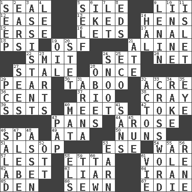 ACROSS 1. Lick closed 5. Filth; sediment 9. Cards in a Roman deck? 12. Relaxation 13. Made supply last 14. Coop moms 15. Celtic language 16. Allows 17. Of or related to the anus 18. Air pressure measure (abbr.) 19. Order of Saint Francis (abbr.) 21. Place in a line 22. Stricken, poetically 24. Put into a specified state 26. Fish or hair follower 27. Showing deterioration from age 28. Single time 29. Lightbulb-shaped fruit 30. Off limits 32. Measure of real estate 36. Penny 37. _ de Janeiro 38. Supercomputer manufacturer 39. Fast planes 40. Confronts 42. Casino tip 43. Zero-star reviews 44. Came up 46. Health resort 49. "One Day ___ Time" 50. Religious women 51. Columnist Joseph or Stewart 53. Compass dir. 54. Armed conflict 57. For fear that 58. Singer James 61. Grand slam 62. Collude with 63. One who doesn't tell the truth 64. SW Asia republic 65. Lair 66. Stitched 67. Singer Brickell DOWN 1. Ooze 2. Hearing organs 3. Helper 4. Area sheltered from the wind 5. Automatic 6. Eisenhower's nickname 7. Allow 8. Begley and Asner 9. Soviet premier 1918-24 10. Empty; void 11. Small island 14. Actor Linden 19. Lubricate 20. Proofreading order 21. Had dinner 23. Shops 24. Snob 25. Environmental prefix 27. Observes 28. Off-Broadway awards 29. Personal Computers (abbr.) 31. Sports stadium 32. NE Massachussets city 33. What you're doing now 34. Libertine 35. Sight organ 40. Floor covering 41. Without 43. Infant food 45. Sorrow 46. First course 47. Cadet 48. NE Netherlands city 52. Baseball player Mel 53. Merit 55. Jai _ 56. French philosopher Descartes 58. Raised railways 59. Neckwear 60. The 23rd letter of the Hebrew alphabet 61. Compete
