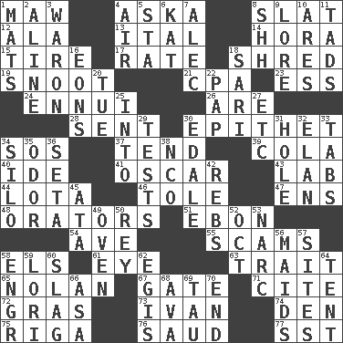 ACROSS 1. Opening into something insatiable 4. "____ silly question..." 8. Narrow board 12. Wing 13. Slanted text style (abbr.) 14. Israeli folk dance 15. Hoop that covers a wheel 17. Pace 18. Tear up 19. Snout, nose 21. Numbers guy (abbr.) 23. Double-curved letter 24. World-weariness 26. "We ___ not amused" (Victoria) 28. Emitted 30. Curse 34. Mayday 37. Watch over 39. Root beer relative 40. Binary compound 41. Witty Wilde 43. Experiment locale 44. Globular water bottle used in Asia 46. Lacquered or enameled metalware 47. Followers of ems 48. Speakers 51. Inky black, to poets 54. "___ Maria" 55. Fraudulent business schemes 58. Raised railways 61. Sight organ 63. Distinguishing feature 65. Pitcher Ryan 67. Yard entry 71. Quote 72. Pate de foie ____ 73. _ the terrible 74. Lair 75. Port city in Latvia 76. Saudi Arabian king (1953-1964) 77. Fast jet (abbr.) DOWN 1. Floor coverings 2. Place in a line 3. Make _____ (do battle with) 4. Wind 5. R.R. building 6. Krazy ___ of comics 7. Actor Baldwin 8. Quiet! 9. Old wives' tales, e.g. 10. Ancient Greek god of war 11. Small amounts or degrees 16. Immeasurably long periods of time 18. Indian skirt 20. Third day of the wk. 22. Infant food 25. To the inside or interior of 27. And so on (abbr.) 29. Trials 30. Peak District village in England 31. Hollow 32. Liveliness 33. Bar bills 34. Grain storage tower 35. Scent 36. Stalk of a moss capsule 38. Non-commissioned officer (abbr.) 42. Confederate soldiers (slang) 45. _ moment's notice (2 wds.) 49. Baking chamber 50. Marina Del _, California 52. Sep. follower 53. Drug cop 56. Unmarried girls 57. Settings 58. Engineer (abbr.) 59. Australian parrot (variant) 60. Volcanic refuse 62. The front part of a cuirass 64. Portable shelter 66. White ___ sheet 68. Actress Gardner 69. The 19th letter of the Greek alphabet 70. Conclusion
