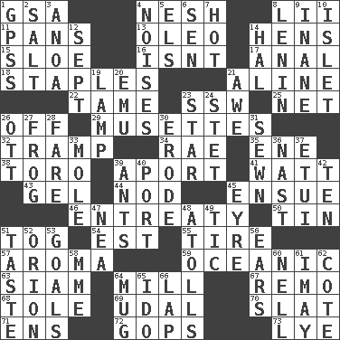 ACROSS 1. Girls' org. (abbr.) 4. Delicate 8. Cards in a Roman deck? 11. Baking dishes 13. Margarine 14. Coop moms 15. _ gin 16. Is not 17. Of or related to the anus 18. Paper fasteners 21. Place in a line 22. Docile 23. Compass dir. 25. Fish or hair follower 26. Not in operation 29. French bagpipes 32. _____ steamer (cargo ship) 34. Actress Charlotte 35. Compass dir. 38. "Corrida" creature 39. To the left, to Queeg 41. Electrical Unit 43. Set 44. Dreamland 45. Take place subsequently 46. Plea 50. Shallow baking pan 51. Coat; cloak 54. Eastern Standard Time (abbr.) 55. Hoop that covers a wheel 57. Scent 59. Pertaining to the sea 63. Thailand, formerly 64. Place where flour is made 67. San ____ (Riviera town) 68. Lacquered or enameled metalware 69. Freehold land 70. Narrow board 71. Followers of ems 72. Republicans 73. Sodium hydroxide DOWN 1. Global Positioning Systems (abbr.) 2. Table seasoning 3. Small Philippine buffalo 4. Annoying sounds 5. Raised railways 6. Elected rep. 7. Being at a high temperature 8. Soviet premier 1918-24 9. Lacking in sense or substance 10. Small island 12. Back-to-school mo. 14. Actor Linden 19. Desk light 20. Australian flightless bird 21. Deep reverence 23. Play the lead 24. Proofreading order 26. Baseball player Mel 27. Toadlike animal 28. Conductor's collection 30. Eat (away) 31. Stitched 33. Undercover agent 36. Political cartoonist Thomas 37. Needle case 39. Pismires 40. Left side of a ship or aircraft 42. Nine, plus one 45. Jane of fiction 47. Teachers' org. 48. Ringlike coral islands and reefs 49. Nervous spasm 51. Clothes sense 52. Constellation of myth 53. Finish lines 56. Hearing organs 58. Madame (abbr.) 60. 1994 drama film starring Jodie Foster 61. "If ____ say so..." 62. ____ d'Azur (French Riviera) 64. Large cup 65. Wedding promise 66. Pet locale