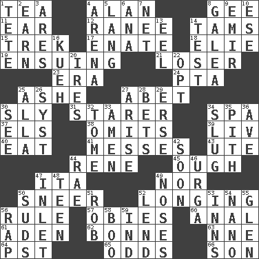 ACROSS 1. Beverage made from leaves 4. ____ Jay Lerner 8. Unit of force equal to gravity 11. Ewer handle 12. The wife of a rajah (variant) 14. Scottish caps 15. Long journey 17. Related on the mother's side 18. Writer Wiesel 19. Taking place subsequently 21. Failure 23. Epoch 24. Parent Teacher Association (abbr.) 25. American tennis player Robert 27. Collude with 30. Mischievous 31. A viewer who gazes fixedly 34. Health resort 37. Raised railways 38. Leaves out 39. 54 in ancient Rome 40. Consume 41. Makes clutter 43. Shoshoni 44. French philosopher Descartes 45. Ending for "Through" and "Enough" 47. Call ___ day 49. And not 50. Scornful expression 52. Yearning 56. Court order 57. Off-Broadway awards 60. Of or related to the anus 61. An important port of Yemen 62. Maid-servant 63. Compass dir. 64. Pacific Standard Time (abbr.) 65. Likelihood 66. Male offspring DOWN 1. Wig 2. Merit 3. Ancient Greek god of war 4. Sports stadium 5. Long (Scottish) 6. Santa ___, CA 7. Fish or hair follower 8. An organ shaped like a helmet 9. Independent ruler or chieftain 10. Compass dir. 13. Snakelike fish 14. Trial 16. Malaysian steamed pastry 20. Angers 22. Choose 25. Silent film actress Nazimova 26. System (abbr.) 27. Ascend 28. Wagers 29. Celtic language 30. Observe 32. Heavy book 33. So be it 34. Snaillike creature with no shell 35. Heart or essence 36. "___ Maria" 42. Within a short period 44. Actress Charlotte 46. Capital and largest city of Mongolia 47. An arm off of a larger body of water 48. Adolescent 49. Olfactory organs 50. Soap bubbles 51. Director Reiner 52. Grant temporary use of 53. Taverns 54. Billionth: prefix 55. Small, secluded valley 56. Reproach for some lapse or misdeed 58. Surprise greeting 59. Indiana (abbr.)