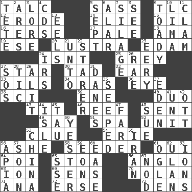 ACROSS 1. Baby powder 5. Backtalk 9. Affectionate concern, for short 12. Eat (away) 14. Writer Wiesel 15. Petroleum 16. Laconic 17. Light colored 18. Nursemaid (var.) 19. Compass dir. 20. A period of five years 23. Dutch treat 24. Is not 25. Jennifer or Joel 27. Play the lead 30. Small amount or degree 32. Ewer handle 33. Petroleums 34. Mouths or openings 36. Sight organ 38. _-fi 39. Compass dir. 40. Superhero pair 43. Teat (slang) 46. Coral ridge 48. Transmitted 49. Declare 51. Health resort 52. A single undivided whole 53. A slight indication 54. 4th largest of the Great Lakes 56. American tennis player Robert 58. Sowing specialist 61. Fr. "Yes" 64. Luau course 65. Portico 66. White American of non-Hispanic descent 68. Electrically charged atom 69. Elected reps. 70. Pitcher Ryan 71. Santa ___, CA 72. Celtic language 73. Lairs DOWN 1. False hair 2. Ancient Greek god of war 3. Old wives' tales, e.g. 4. Music discs 5. Back-to-school mo. 6. Having or resembling wings 7. Fodder prepared in a silo 8. Observe 9. Sycophant 10. Pale green bean 11. Dollar (slang) 13. Snakelike fish 21. To (old English) 22. A viewer who gazes fixedly 23. Suggestive of the supernatural 24. Big collection agency 26. Actress Charlotte 27. Distress signal 28. Nervous spasm 29. Set down 31. Natives or inhabitants of Denmark 35. Oozed 37. Genesis locale 41. Corn or form start 42. Baseball player Mel 44. Capri or Wight 45. The 19th letter of the Greek alphabet 47. Conductor's collection 48. Institute legal proceedings 50. Last 53. Large country 55. SW Asia republic 56. Capital of Western Samoa 57. Within a short period 59. Immeasurably long periods of time 60. Comfort 61. Stare at amorously 62. ____ Bator 63. Charged particles 65. Compass dir. 67. Lower and raise head in agreement