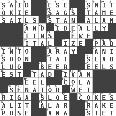 ACROSS 1. Expressed in words 5. Compass dir. 8. Stricken, poetically 12. Migrant worker of the '30s 13. Droops 15. Not wild 16. Travels by water 18. Comedian Laurel of Laurel & Hardy 19. ____ Jay Lerner 20. Plus 22. Under perfect conditions 24. Airtight sealed metal containers 26. She-sheep 27. Slanted text style (abbr.) 28. Ending with capital 29. Writing tablet 32. To the inside or interior of 35. Like ___ of sunshine 37. Cuckoo 38. Within a short period 39. Make lace 40. Thick slice 41. Nilotic language 42. Fermented drink made from hops 43. Snakelike fish 44. Eastern Standard Time (abbr.) 45. Small amount or degree 46. _ the terrible 49. Snakelike fish 50. Root beer relative 51. Legislator 55. Dripping 56. Port city in Latvia 57. _ gin 59. Popular sodas 63. Came down and settled, as after flight 64. Having or resembling wings 65. Libertine 66. Introduce or present, as a question 67. Nanny (var.) 68. Proofreading order DOWN 1. Mayday 2. Alias (abbr.) 3. One more than two 4. Accusation by an informer 5. Curvy letter 6. Suttee (variant) 7. Mild oath 8. Lacking originality or spontaneity 9. Shopping center 10. "If ____ say so..." 11. Nine, plus one 14. Dwarf with a sinus problem 17. In a ____ (agitated or irritated) 21. Heredity factor (abbr.) 23. Deep reverence 25. Scheduled 28. Of or pertaining to medicine 29. Light colored 30. Of or related to the anus 31. Claim 32. Small island 33. Horse sense 34. A blast of a horn 36. Actress Charlotte 40. Elected representatives 42. Greek mezzo-soprano Agnes 45. Beverage made from leaves 47. Promise 48. Actor Baldwin 49. Related on the mother's side 51. Grain storage tower 52. Armor plate that protects the chest 53. Water jar 54. Wander aimlessly 56. Hit sharply and swiftly 58. Period 60. Krazy ___ of comics 61. Make supply last 62. Put into a specified state