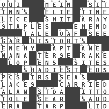 ACROSS 1. Fr. "Yes" 4. Chow _ 8. Be seated 11. Restaurants 13. Writer Wiesel 14. Prong on a fork 15. Louse (plural) 16. Stricken, poetically 17. Like ___ of sunshine 18. Paper fasteners 21. Make improvements or corrections to 22. Lie 23. Clumsy lout 25. Observe 26. Slender fish 29. What propaganda does 32. Foe 34. Fitting 35. One (Scot) 38. Grandmother 39. Laconic 41. Immoral or dissolute person 43. Trim (branches) 44. Followers of ems 45. Locates 46. Most dark, concealed or hidden 50. Begley and Asner 51. Personal Computers (abbr.) 54. Big collection agency 55. Oceans 57. Shoestrings 59. Borne 63. ____ Jay Lerner 64. Portico 67. "Tell ____ the Marines!" 68. Lacquered or enameled metalware 69. Shrivel 70. Saudi Arabian king (1953-1964) 71. Epoch 72. Canvas cover 73. Flaplike covering DOWN 1. Lubricates 2. A single undivided whole 3. South American Indian 4. Makes clutter 5. Shade tree 6. One more than two 7. Fish or hair follower 8. Begets 9. Empty; void 10. Miss Universe 1986, Barbara Palacios _ 12. Back-to-school mo. 14. Scottish cap 19. Kenny Rogers chart-topper in '80 20. Biblical high priest 21. Lizard (obsolete) 23. I made a mistake 24. Johnson of "Laugh-In" 26. Commissioned mil. rank 27. Of or related to the anus 28. Western Nevada city 30. Tarsus (plural) 31. Indian skirt 33. Atlas contents 36. Nathan's nickname 37. Made supply last 39. Rend 40. Conclusions 42. Double-curved letter 45. Play the lead 47. Part of HMS, perhaps 48. Fortification 49. Ocean 51. Food holder 52. Bodily heat indicating an inflammation 53. Any of the three canals of the cochlea 56. Indian titles of respect 58. Compass dir. 60. Slanted text style (abbr.) 61. Needle case 62. Texas town _ City 64. Fast jet (abbr.) 65. Beverage made from leaves 66. Rowing implement