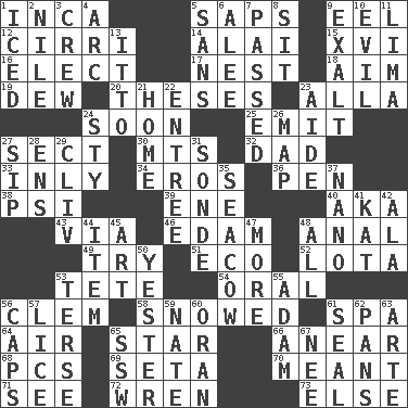 ACROSS 1. South American Indian 5. Plant excrements 9. Snakelike fish 12. High-altitude cloud 14. Mountain range southwest of Kyrgyzstan 15. 16 16. Opt 17. A home for chicks 18. Direct toward a target or goal 19. Morning condensation 20. College papers 23. Silent film actress Nazimova 24. Within a short period 25. Send forth 27. Religious group 30. Mountains (abbr.) 32. June honoree 33. In an inward manner 34. Greek god of love 36. Animal enclosure 38. 23rd letter of the Greek alphabet 39. Compass dir. 40. Alias (abbr.) 43. By way of 46. Dutch treat 48. Of or related to the anus 49. Attempt 51. Environmental prefix 52. Globular water bottle used in Asia 53. Wig 54. Taken by mouth 56. Clement's nick name 58. Overwhelmed 61. Health resort 64. Wind 65. Play the lead 66. Approach 68. Personal Computers (abbr.) 69. Bristle 70. Intended 71. Observe 72. Songbird 73. Otherwise DOWN 1. On the rocks 2. Mediterranean tributary 3. Group working together 4. Curve 5. Without 6. Toward shelter 7. Went by 8. Be seated 9. Glorify 10. Morally bad or wrong 11. Pale green bean 13. "Tell ____ the Marines!" 21. Dwelling 22. Main course 23. Helper 24. Filthy place 26. Atlas unit 27. Small drink 28. Followers of ems 29. 154 in Roman numerals 31. Something which is sent 35. Manatee 37. Billionth: prefix 41. Krazy ___ of comics 42. Wing 44. A distinct part 45. Nonscientific branch of learning 47. Greater amount 48. Everything 50. Of or pertaining to yesterday 53. Laconic 55. First of billions? 56. Smile enhancers 57. Louse (plural) 59. Nathan's nickname 60. Northwest Algerian city 61. Lick closed 62. Zero-star reviews 63. Johnson of "Laugh-In" 65. Compass dir. 67. Born