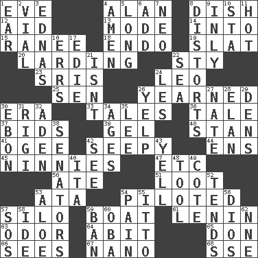 ACROSS 1. First lady 4. ____ Jay Lerner 8. Food container 12. Assist 13. Method 14. To the inside or interior of 15. Indian princess (variant) 18. Inside; within (prefix) 19. Narrow board 20. Preparing or cooking with lard 22. Filthy place 23. Indian titles of respect 24. Lion 25. Elected rep. 26. Had a strong desire 30. Epoch 33. Stories 36. Falsehood 37. Auction offers 39. Set 40. Comedian Laurel of Laurel & Hardy 41. Double curve, resembling the letter S 42. Oozy 44. Followers of ems 45. Fools 47. And so on (abbr.) 50. Had dinner 51. Plunder 53. "One Day ___ Time" 54. Manned the helm 57. Grain storage tower 59. Water vessel 61. Soviet premier 1918-24 63. Aroma 64. "This won't hurt ____!" 65. Spanish title 66. Perceives with the eye 67. Billionth: prefix 68. Compass dir. DOWN 1. Hearing organ 2. Small bottle 3. Ferber et al. 4. So be it 5. Having great length 6. Increase 7. Modern: prefix 8. What propaganda does 9. Inwardly 10. R.R. building 11. Being at a high temperature 16. Blunders 17. Singer Brickell 21. Is not 22. Ocean 24. French article 26. Sharp bark 27. Nathan's nickname 28. Style 29. Cub Scout units 30. Inky black, to poets 31. Swiss mountan, "Queen of the Mountains" 32. Arabian gulf 34. Eons 35. Area sheltered from the wind 38. Legislators 42. Perceive with the eye 43. Shout 46. Call ___ day 48. Implement 49. ____ d'Azur (French Riviera) 52. Looks after 53. _ vera 54. Ache 55. "Tell ____ the Marines!" 56. "Vaya con ____" 57. Mayday 58. Binary compound 59. Prohibit 60. Chief or king in Benin or Nigeria 62. Compass dir.