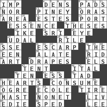 ACROSS 1. Naughty child 4. Cub Scout units 8. Writing tablets 12. Not either 13. Abounding in pines 14. Mouths or openings 15. Length times width 17. _____ Park, CO 18. Sweet dark-red dessert wine 19. Center 21. College papers 23. D.D.E's nickname 24. _ Lanka 26. Sight organ 27. Freehold land 28. Cause heat under the collar 30. Compass dir. 31. Fortification 34. Definite Article 37. Car or cant ending 38. Having winglike extensions 39. To free from 40. Nonscientific branch of learning 41. Window treatments 42. Raised railways 43. Portable shelter 44. Slanted text style (abbr.) 46. "___ Little Indians" 47. Curvy letter 50. Small boy 51. Centers 54. Eat 57. Legendary monster 58. Learning spot: Fr. 60. Hoop that covers a wheel 62. Vertical spar for supporting sails 63. Music written for nine 64. 54 in ancient Rome 65. Singer Brickell 66. Moved rapidly 67. Area sheltered from the wind DOWN 1. _ tizzy (2 wds.) 2. Greater amount 3. Elected leader of a country 4. Plates 5. Keyboard key 6. Born 7. System (abbr.) 8. Wimpy's pal 9. Came up 10. Have the gumption 11. Fast planes 13. Fenced enclosure 16. "____ silly question..." 20. Snakelike fish 22. Aid 25. Feeling or showing extreme anger 27. One who uses or employs something 29. Angers 30. Ocean 31. Merit 32. Schedule 33. Head covering 34. Excercise machine 35. Land elevation 36. Begley and Asner 41. Gouge 43. Cigar-shaped 44. ___ a Wonderful Life 45. Strained 46. Tarsus (plural) 48. Biscuitlike quick bread 49. Having a sole or soles 51. Residence 52. Mild oath 53. Elected reps. 55. Remaining after all deductions 56. One of the Great Lakes 59. Police officer (slang) 61. First lady