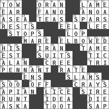 ACROSS 1. Pull behind 4. Northwest Algerian city 8. Unable to walk 12. Hearing organ 13. Papal veil 14. Small Philippine buffalo 15. Toward the sea 17. Afternoon social gatherings 18. Practice fights 19. Musical pauses 21. Snakelike fish 23. Area sheltered from the wind 24. Discontinues 26. Chop off 28. Female horse 30. Shoved, as through a crowd 34. Part of HMS, perhaps 37. SW Asia republic 39. Not wild 40. Eastern Standard Time (abbr.) 41. Costumes for special activities 43. Nervous spasm 44. ____ Jay Lerner 46. Algonquian 47. Three (prefix) 48. Pre-World Series prize 51. Assign a rank or rating to 54. Followers of ems 55. Hits or strikes with great force 58. "Barney Miller" actor Jack 61. No longer planned or scheduled 63. Trading vessels 65. Bee-related 67. Louse (plural) 71. Title for a man of rank and authority 72. The smallest animal of a litter 73. The content of cognition 74. Expire 75. "____ silly question..." 76. A blast of a horn 77. Plant excrement DOWN 1. Lacerate 2. Fertile tracts in a desert 3. Obtain by seizing forcibly or violently 4. Often (poetically) 5. Actress Charlotte 6. Santa ___, CA 7. Sense of smell 8. Pet locale 9. Of or related to the anus 10. Greater amount 11. Relaxation 16. Tiny particle 18. Messy guy 20. Health resort 22. Pipe bend 25. Indian titles of respect 27. Plant holder 29. Spew [out] 30. Keyboard key 31. Electrical Unit 32. Independent ruler or chieftain 33. Tenth: prefix 34. Pile 35. Small island 36. Comedian Laurel of Laurel & Hardy 38. Atmosphere 42. Oceans 45. Compass dir. 49. At once, immediately (arch.) 50. Science/research agcy. 52. Affectionate concern, for short 53. Hearing organs 56. Women servants 57. Damascus' land 58. "Two Mules for Sister ____" 59. Musical composition 60. Pig sound 62. Secret move to avoid paying debts 64. Ooze 66. "One Day ___ Time" 68. Wedding promise 69. Corporate head (abbr.) 70. Ingest