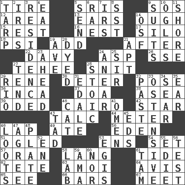 ACROSS 1. Become fatigued 5. Indian titles of respect 9. Mayday 12. Length times width 13. Hearing organs 14. Ending for "Through" and "Enough" 15. Respite 16. A home for chicks 17. Grain storage tower 18. 23rd letter of the Greek alphabet 19. Say or write further 21. Following 22. _ Jones' Locker 24. Viper 26. Compass dir. 27. Giggle 28. In a ____ (agitated or irritated) 29. French philosopher Descartes 30. Prevent from occurring 32. Airs 36. South American Indian 37. ___ good deed 38. At sea 39. Wrote a lyric poem 40. Capital of Egypt 42. Play the lead 43. Baby powder 44. Distance measurement 46. Infant locale 49. Had dinner 50. Locale of original sin 51. Stared 53. Followers of ems 54. Put into a specified state 57. NW Algerian seaport 58. Austrian-born American filmmaker Fritz 61. Periodic rise and fall of the sea level 62. Wig 63. Mine, in Marseilles 64. Deliberation 65. Perceive with the eye 66. Taverns 67. Confront DOWN 1. Canvas cover 2. Angers 3. Home 4. Ingest 5. Transmit 6. Actress Charlotte 7. Big collection agency 8. Fast jet (abbr.) 9. Costumes for special activities 10. Stares at amorously 11. Dinah or Pauly 14. Order of Saint Francis (abbr.) 19. "___ Maria" 20. Colored 21. Fitting 23. Toward the future 24. Approach 25. Title for a knight 27. Be inclined (to) 28. Unemotional 29. _ de Janeiro 31. Peak District village in England 32. Thick mixture 33. Clearly or manifestly demonstrative 34. Burn superficially 35. Hearing organ 40. Feline 41. Sign of things to come 43. Bit 45. Begley and Asner 46. Plunders 47. Match 48. Food holder 52. Compass dir. 53. Armor plate that protects the chest 55. Singer Brickell 56. Trial 58. Experiment locale 59. Nanny (var.) 60. And not 61. Scottish cap