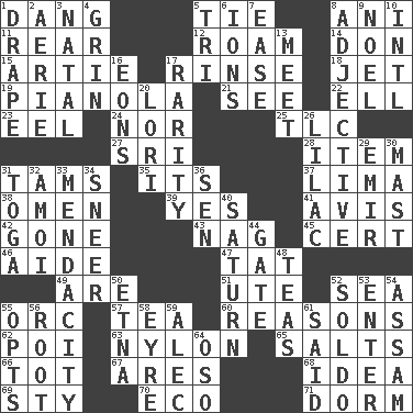 ACROSS 1. Mild oath, euphamism for damn 5. Neckwear 8. Black tropical American cuckoo 11. Posterior 12. Wander aimlessly 14. Spanish title 15. Nick name for Arthur 17. Remove soap 18. Passenger plane 19. Player piano 21. Observe 22. Pipe bend 23. Snakelike fish 24. And not 25. Affectionate concern, for short 27. Indian title of respect (Mr.) 28. A whole individual unit 31. Scottish caps 35. ___ a Wonderful Life 37. Pale green bean 38. Sign of something about to happen 39. Consenting reply 41. Advice 42. Went 43. Tired old horse 45. Foregone conclusion 46. Assistant 47. Make lace 49. "We ___ not amused" (Victoria) 51. Shoshoni 52. Ocean 55. The grampus (Milton) 57. Afternoon social gathering 60. Thinks logically 62. Luau course 63. Thermoplastic polyamide 65. Table seasonings 66. Small child 67. Ancient Greek god of war 68. The content of cognition 69. Filthy place 70. Environmental prefix 71. Dormintory (informal) DOWN 1. Window treatment 2. Nest on high 3. Relating to or accompanying birth 4. Broad smile 5. Three (prefix) 6. Charged atoms 7. Relaxation 8. Descriptive word 9. Christmas carol 10. International (abbr.) 13. Confront 16. Immeasurably long periods of time 17. Noteworthy scarcity 20. Australian parrot (variant) 26. Pale purple color 29. Independent ruler or chieftain 30. Vertical spar for supporting sails 31. Ancient Roman robe 32. Mine, in Marseilles 33. Ananias' fault 34. Scornful expression 36. Elected rep. 40. Titan orbits this 44. Yard entry 48. Beverages made from leaves 50. Inactive volcano in Sicily 52. Twentieth part of a lira 53. Keyboard key 54. Indian state 55. Elects 56. Carrot, for example 58. Jane of fiction 59. Actor Baldwin 61. Alleged 64. Bear (Spanish)