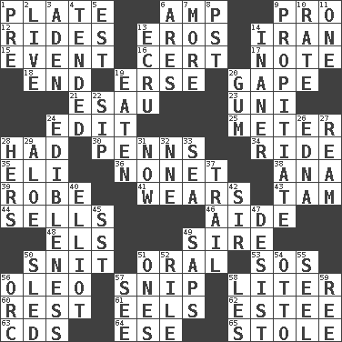 ACROSS 1. Food holder 6. Electrical Unit 9. Adept person 12. Amusement-park features 13. Greek god of love 14. SW Asia republic 15. Happening 16. An absolute certainty 17. Observe 18. Conclusion 19. Celtic language 20. Stare wonderingly 21. He sold his birthright 23. University (slang) 24. Prepare for publication 25. Distance measurement 28. Possessed 30. Actor Sean's family 34. Travel on an animal 35. Connecticut Ivy Leaguer 36. Music written for nine 38. Santa ___, CA 39. Loose flowing garment 41. Erodes 43. Scottish cap 44. Makes a sale 46. Helper 48. Raised railways 49. Title for a man of rank and authority 50. In a ____ (agitated or irritated) 51. Taken by mouth 53. Distress signal 56. Butter sub 57. Sever or remove by pinching or nipping 58. 61 cubic inches 60. Relief 61. Snakelike fish 62. First name in cosmetics 63. Music discs 64. Compass dir. 65. Fur scarf DOWN 1. Before (prefix) 2. Moving, as bait 3. An important port of Yemen 4. Watched over 5. Eastern Standard Time (abbr.) 6. Ancient Greek god of war 7. Greater amount 8. Pacific Standard Time (abbr.) 9. Appease 10. Pace 11. Single 13. Shade of tan 14. Sillier 19. Eroded 20. Chewing product 22. Small drink 24. The property of being fit to eat 26. Pulitzer Prize-winning author Ferber 27. 480, 500 or 516 sheets of paper 28. Possessive pronoun 29. Medicinal plant 31. At this time 32. Compass dir. 33. Ocean 37. Drop behind 40. American author Paul (1891-1958) 42. Title for a knight 45. Fast jet (abbr.) 47. Stop 49. Plant excrements 50. Downhill vehicle 51. Singles 52. Cause heat under the collar 54. Von Bismarck 55. Sew up the eyelids of hawks and falcons 56. The grampus (Milton) 57. Observe 58. French article 59. To riddle