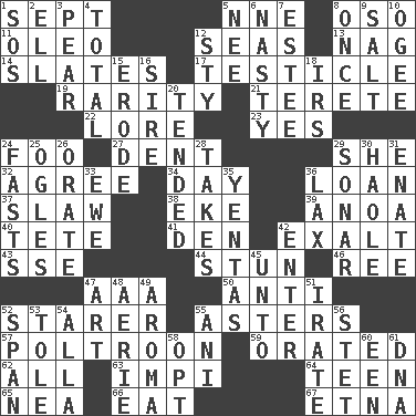 ACROSS 1. Back-to-school mo. 5. Compass dir. 8. Bear (Spanish) 11. Butter sub 12. Oceans 13. Tired old horse 14. Chalkboards 17. A testis 19. Noteworthy scarcity 21. Cylindrical with tapered ends 22. Old wives' tales, e.g. 23. Affirmative reply 24. Egg _ yung 27. Undesirable depression on a surface 29. A female animal or person 32. Match 34. 24 hours 36. Grant temporary use of 37. Cole _ (cabbage dish) 38. Make supply last 39. Small Philippine buffalo 40. Wig 41. Lair 42. Glorify 43. Compass dir. 44. Astound 46. Portuguese money of account (variant) 47. Auto club (abbr.) 50. Opposed to 52. A viewer who gazes fixedly 55. Michaelmas daisies 57. Characterized by complete cowardliness 59. Spoke pompously 62. 100% 63. Body of Kaffir warriors 64. Adolescent 65. Teachers' org. 66. Erode 67. Inactive volcano in Sicily DOWN 1. Distress signal 2. Pipe bend 3. Lightbulb-shaped fruit 4. Add up to 5. Born 6. Offensive 7. First name in cosmetics 8. At one time in the past 9. Table seasoning 10. Double curve, resembling the letter S 12. Filthy place 15. Eat (away) 16. Father 18. Big collection agency 20. Looked after 24. Goes without food and/or water 25. Stares 26. Declaim 28. Receives possession of 29. Echolocation 30. White Person, in Hawaii 31. Related on the mother's side 33. She-sheep 35. Gossips 36. Not strict 42. Keyboard key 45. To (old English) 47. Tate display 48. Nest on high 49. Odor 51. Feeling or showing extreme anger 52. Connect, as a bridge 53. Lacquered or enameled metalware 54. Silent film actress Nazimova 55. Cuckoo 56. Proofreading order 58. Choose 60. Car or cant ending 61. Heredity factor (abbr.)