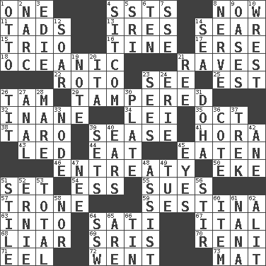 ACROSS 1. Single 4. Fast planes 8. At this time 11. Bits 13. Angers 14. Wither 15. Musical group of three 16. Prong on a fork 17. Celtic language 18. Pertaining to the sea 21. All-night dance parties 22. Printing process, for short 23. Observe 25. Eastern Standard Time (abbr.) 26. Scottish cap 29. ________ with (broke a safety seal) 32. Empty; void 34. Flowery wreath 35. Sep. follower 38. Pacific island yam 39. Gospel singer Marvin 41. Israeli folk dance 43. Directed 44. Consume 45. Ingested 46. Plea 50. Make supply last 51. Put into a specified state 54. Curvy letter 55. Institutes legal proceedings 57. Marketplace scale 59. French poetic form 63. To the inside or interior of 64. Suttee (variant) 67. Slanted text style (abbr.) 68. One who doesn't tell the truth 69. Indian titles of respect 70. Painter Guido (1575-1642) 71. Snakelike fish 72. Left 73. Floor protector DOWN 1. Von Bismarck 2. Drug cop 3. Singer Brickell 4. "Cheers" or "Ellen" 5. Indian title of respect (Mr.) 6. "___ Little Indians" 7. Compass dir. 8. Effrontery 9. Fertile tracts in a desert 10. Take or capture by force 12. Fly high 14. Ocean 19. Short letter 20. Call ___ day 21. Portuguese money of account (variant) 23. Perceives with the eye 24. 4th largest of the Great Lakes 26. Teat (slang) 27. Of or related to the anus 28. Female horse 30. Food holder 31. Capital of the state of Qatar 33. Connecting point 36. ____ d'Azur (French Riviera) 37. Long journey 39. Arranges properly for use 40. Hearing organs 42. One (Scot) 45. Snake ____ (dice throw) 47. Born 48. Aid 49. Third day of the wk. 51. Vertical member of a panel or frame 52. Bert's buddy 53. Add up to 56. Commotion 58. Not either 60. A distinct part 61. Nanny 62. Came down and settled, as after flight 64. Compass dir. 65. "We ___ not amused" (Victoria) 66. Shallow baking pan
