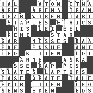ACROSS 1. Actor Linden 4. Tiny particle 8. Inactive volcano in Sicily 12. "We ___ not amused" (Victoria) 13. Sports stadium 14. SW Asia republic 15. Letter starter 17. One who wires 18. Small pie 19. Paper fasteners 21. Value system 23. Part of HMS, perhaps 24. Luau accessory 26. Snakelike fish 27. Painter Guido (1575-1642) 28. Play the lead 30. Slender fish 31. Makes clutter 34. Sound made by sheep 37. Supplement with great effort 38. Take place subsequently 39. Black tropical American cuckoo 40. Directed 41. Baby cat 42. Small bed 43. Queen of England 1702-14 44. "____ silly question..." 46. Compass dir. 47. Hit sharply and swiftly 50. Personal Computers (abbr.) 51. Chalkboards 54. Portable computers 57. Comfort 58. Declaim 60. Lie 62. Independent ruler or chieftain 63. 61 cubic inches 64. Corporate head (abbr.) 65. Elected reps. 66. Genesis locale 67. Begley and Asner DOWN 1. Possessed 2. Ancient Greek god of war 3. Resembling or made to resemble leather 4. Satellite of Uranus 5. Laconic 6. Single 7. Female horse 8. One or the other of two 9. Drop behind 10. Drug cop 11. Pismires 13. Leather borer 16. Water falling in drops from the sky 20. Air pressure measure (abbr.) 22. Beverages made from leaves 25. Come out of 27. Libertine 29. Adolescent 30. Set 31. Count _ (2 wds.) 32. Keyboard key 33. Fast jet (abbr.) 34. Keyboard key 35. Small Philippine buffalo 36. Small island 41. Leg joint 43. Michaelmas daisies 44. Fitting 45. Native of Scotland 46. Indian antelope 48. Having winglike extensions 49. Eucharist need 51. Perceives with the eye 52. Unable to walk 53. Flatfish 55. For each 56. Downhill vehicle 59. To free from 61. Greek goddess of the dawn
