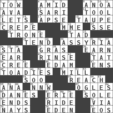 ACROSS 1. Pull behind 4. Among 8. Small Philippine buffalo 12. Actress Gardner 13. Indian skirt 14. Utensil 15. Allows 17. Domed church section 18. Grayish beige 19. Streamer paper 21. Madame (abbr.) 23. Compass dir. 24. Marketplace scale 26. Small amount or degree 28. Be inclined (to) 30. Nineveh was its capital 34. R.R. building 37. Pate de foie ____ 39. Merit 40. Hearing organ 41. Wash lightly 43. Make lace 44. Algonquian 46. Dutch treat 47. Followers of ems 48. Sycophants 51. Place where flour is made 54. "Barney Miller" actor Jack 55. Arrive at 58. Santa ___, CA 61. Compass dir. 63. Stares at amorously 65. Natives or inhabitants of Denmark 67. 4th largest of the Great Lakes 71. Not divided or shared with others 72. Extremities 73. Travel on or in a vehicle 74. By way of 75. Negative votes 76. Locale of original sin 77. Greek goddess of the dawn DOWN 1. Baby powder 2. Unconcealed 3. Wetness 4. White ___ sheet 5. Atlas unit 6. Big collection agency 7. South Vietnam president (1954) 8. "One Day ___ Time" 9. Common sense 10. I made a mistake 11. Toward shelter 16. Blemish 18. Afternoon social gatherings 20. Compass dir. 22. Mountains (abbr.) 25. Engineer (abbr.) 27. Color 29. Frees from moisture 30. Indian state 31. Pace 32. SW Asia republic 33. Pismires 34. Religious group 35. Pacific island yam 36. Length times width 38. Also 42. Arab leader 45. Begley and Asner 49. Charged particles 50. A really long time 52. Lion 53. Falls behind 56. Garlic unit 57. Sun: prefix 58. An important port of Yemen 59. Grandmother 60. "60 Minutes" Commentator Rooney 62. We are 64. Oceans 66. Curvy letter 68. To free from 69. Binary compound 70. Car or cant ending