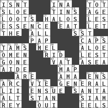 ACROSS 1. Is not 5. _ tizzy (2 wds.) 8. Small child 11. A type of plum 12. Canisters 14. Mature 15. Plunders 17. Rings 18. French article 19. Core 21. Consume 22. Allow 23. Definite Article 24. Everything 25. Fast jet (abbr.) 27. Infant food 28. Balmoral and tarboosh 31. Scottish caps 35. Cartoonist voice _ Blanc 37. Medicinal plant 38. Sign of something about to happen 39. To free from 41. For fear that 42. Went 43. Large container 45. At sea 46. Assistant 47. Atlas unit 49. "We ___ not amused" (Victoria) 51. Nursemaid (var.) 52. Followers of ems 55. Curve 57. Compete 60. Commissioned military rank 62. Cards in a Roman deck? 63. Take place subsequently 65. Before Barbara or Clara 66. The first octave above the treble staff 67. Comedian Laurel of Laurel & Hardy 68. Thailand, formerly 69. Marina Del _, California 70. Fr. "Yes" 71. Snakelike fish DOWN 1. Small island 2. Agitate, as a liquid 3. Trap for birds or small mammals 4. Wig 5. Call ___ day 6. "Death on the ____" 7. Small Philippine buffalo 8. Baron Munchausen's specialties 9. Double curve, resembling the letter S 10. Trial 13. Fast planes 16. Fastener 17. Assistant 20. Burrowing marine mollusk 26. Any of the three canals of the cochlea 29. Airs 30. Stalk of a moss capsule 31. Ancient Roman robe 32. Mine, in Marseilles 33. Ananias' fault 34. Contemptuous expression 36. 54 in ancient Rome 40. Break 44. Docile 48. Zero-star reviews 50. Nights before holidays 52. Bert's buddy 53. Relating to or accompanying birth 54. Hits or strikes with great force 55. Having or resembling wings 56. Cause heat under the collar 58. To the inside or interior of 59. He sold his birthright 61. Relaxation 64. Single; one (prefix)