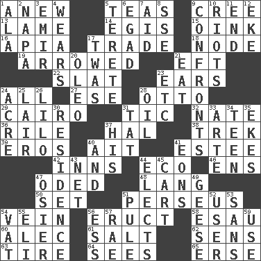 ACROSS 1. Afresh 5. Beverages made from leaves 9. Algonquian 13. Unable to walk 14. The front part of a cuirass 15. Pig sound 16. Capital of Western Samoa 17. Swap 18. Connecting point 19. Moved like an arrow 21. Bank Draft (abbr.) 22. Narrow board 23. Hearing organs 24. 100% 27. Compass dir. 28. Von Bismarck 29. Capital of Egypt 31. Nervous spasm 32. Nathan's nickname 36. Cause heat under the collar 37. Actor Linden 38. Long journey 39. Greek god of love 40. Small island 41. First name in cosmetics 42. Taverns 44. Environmental prefix 46. Followers of ems 47. Wrote a lyric poem 48. Austrian-born American filmmaker Fritz 50. Put into a specified state 51. Son of Zeus who helped slay Medusa 54. Distinctive style or manner 56. Spew [out] 58. Son of Isaac 60. Actor Baldwin 61. Table seasoning 62. Elected reps. 63. Hoop that covers a wheel 64. Observes 65. Celtic language DOWN 1. Chicken ___ king 2. California wine valley 3. Arab leader 4. Erodes 5. Cylindrical with tapered ends 6. Mild oath 7. Assist 8. Compass dir. 9. Meets 10. Debaucheries 11. Conclusion 12. Supplement with great effort 17. It was, poetically 20. Margarine 21. Erode 23. And so on (abbr.) 24. Measure of real estate 25. Den 26. _ and Stitch 28. Petroleum 30. Home 31. Make lace 33. Johnson of "Laugh-In" 34. Adolescent 35. Supplements with great effort 37. Part of HMS, perhaps 40. Added to 41. Immeasurably long periods of time 43. Remaining after all deductions 44. Opts 45. Heavy open wagon 47. Flexible twig of a willow tree 49. Honkers 51. Whine 52. One who makes use of a thing 53. Without 54. Large container 55. Biblical high priest 56. Double-curved letter 57. Actress Charlotte 59. Purpose