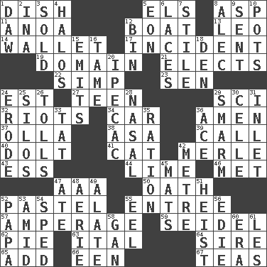 ACROSS 1. Food container 5. Raised railways 8. Cleo's killer 11. Small Philippine buffalo 12. Water vessel 13. Lion 14. Place for singles 17. Happening 19. Kingdom 21. Chooses 22. Simple or foolish person 23. Elected rep. 24. Eastern Standard Time (abbr.) 27. Adolescent 29. _-fi 32. Disturbances 34. Automobile 36. So be it 37. Water jar 38. White ___ sheet 39. Give a ring to 40. Stupid person 41. Domesticated feline 42. Haggard of country music 43. Curvy letter 44. Citrus frut 46. Was introduced to 47. Auto club (abbr.) 50. Pledge 52. Soft color 55. Main course 57. Electrical Measurement 59. A glass for beer 62. Sliced dessert 63. Slanted text style (abbr.) 64. Male parent of an animal 65. Increase 66. Car or cant ending 67. Beverages made from leaves DOWN 1. Fool 2. _ tizzy (2 wds.) 3. Exchanged or delivered for money 4. Auras 5. A really long time 6. Shoestrings 7. Vertical member of a panel or frame 8. Actor Baldwin 9. Emitted 10. Cooking vessels 12. Storage container 15. Sends forth 16. Not wild 18. Lair 20. Medicinal drug used to evoke vomiting 24. Eat (away) 25. Grain storage towers 26. For Whom the Bell _____ 28. Rhinal 29. Excessive but superficial compliments 30. Cell (Danish) 31. An arm off of a larger body of water 33. Make lace 35. Food allowance for one day 36. Adept person 42. Distance measurement (Brit.) 45. Floor coverings 47. Had dinner 48. Nest on high 49. Having winglike extensions 51. Robbery 52. Dad 53. Among 54. Drove too fast 55. Snakelike fish 56. Singer Brickell 58. Separate the seeds from cotton 60. Period 61. French article